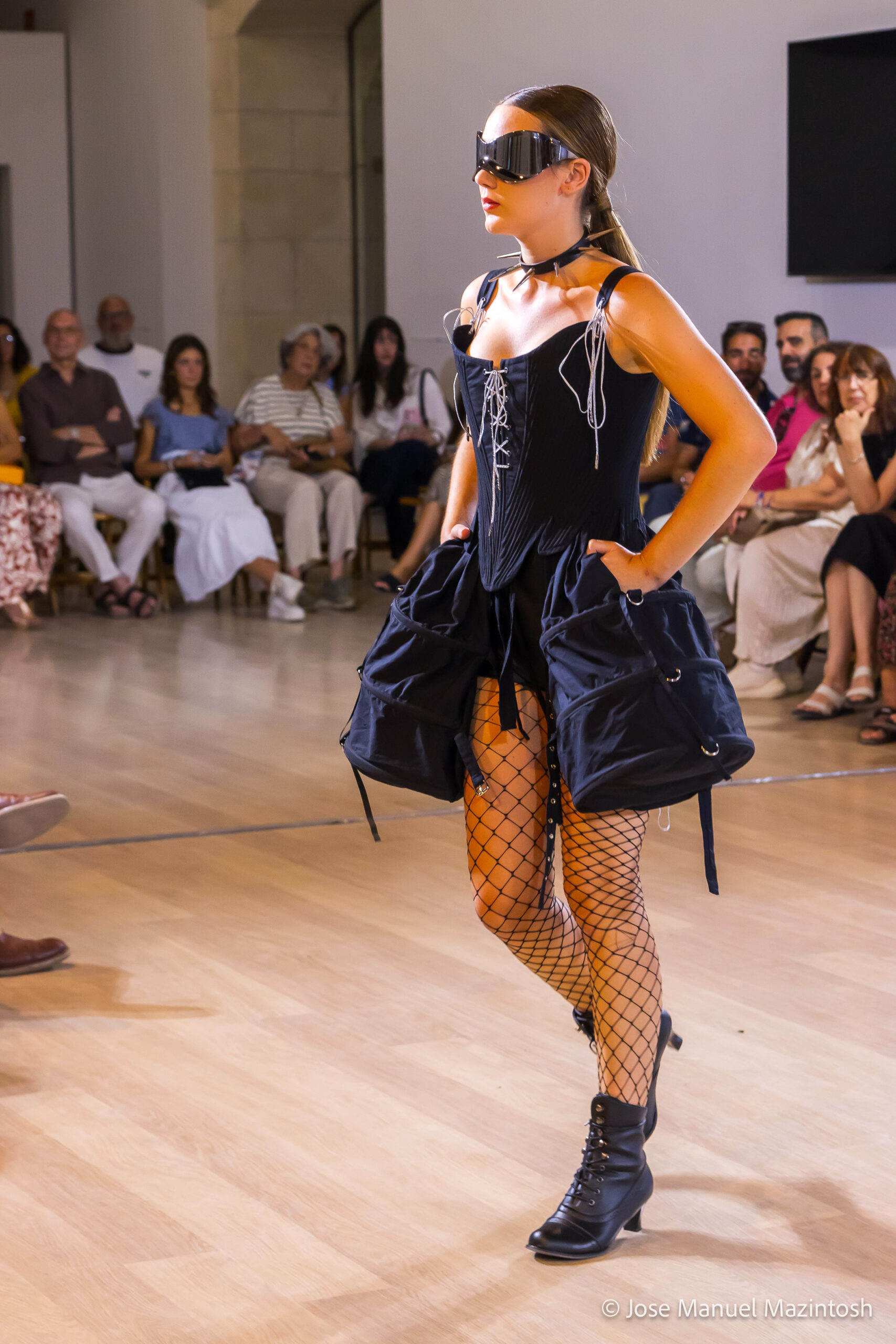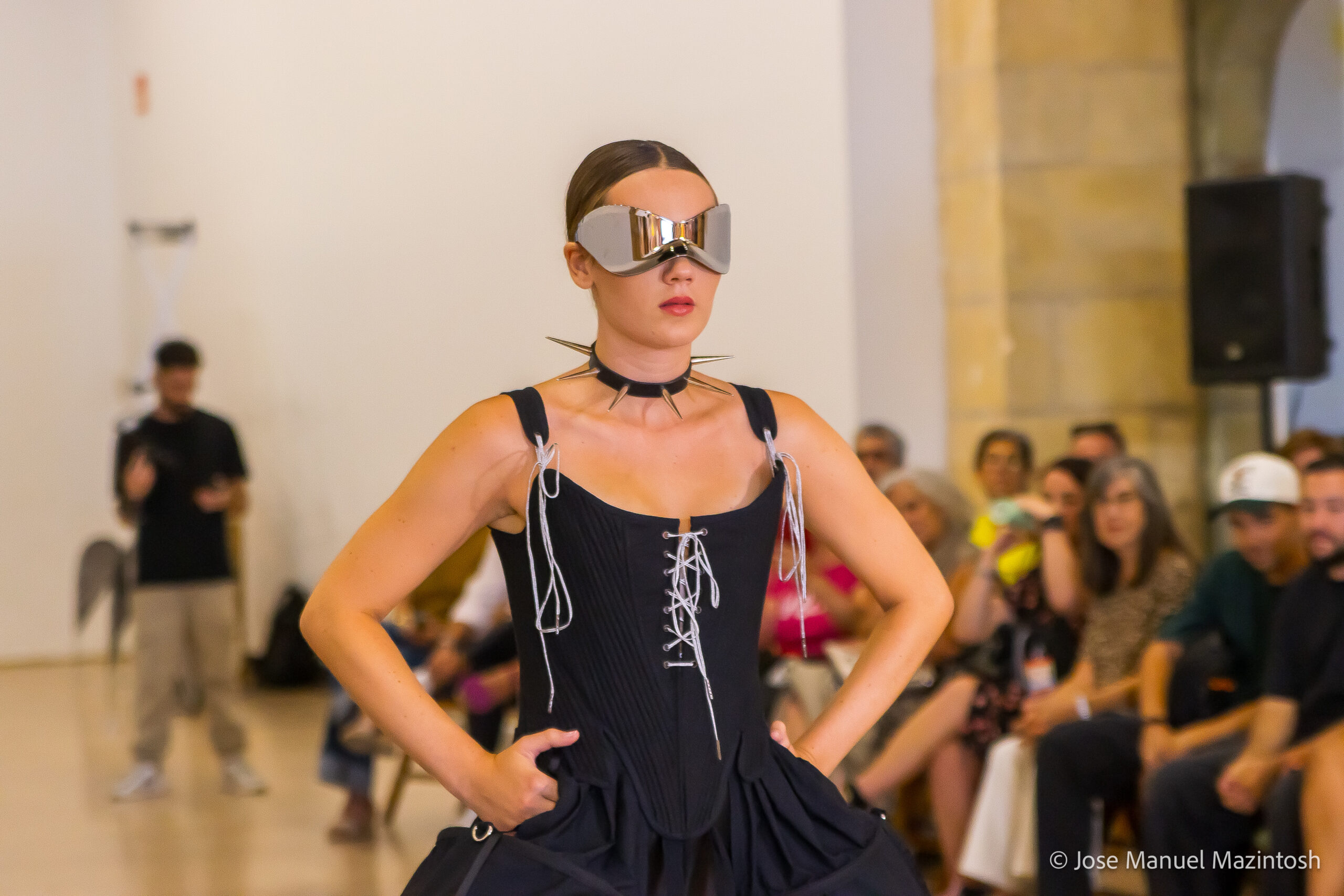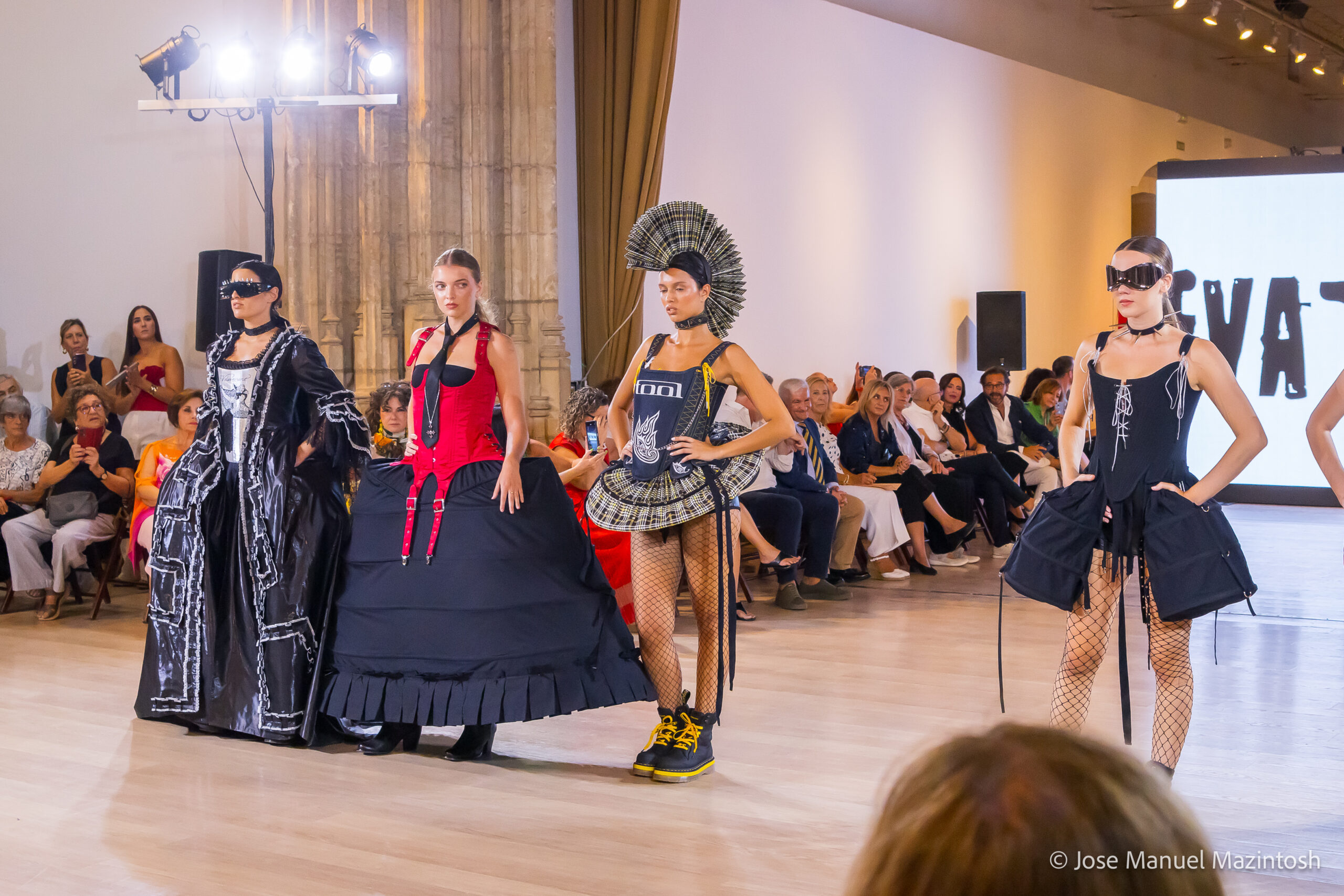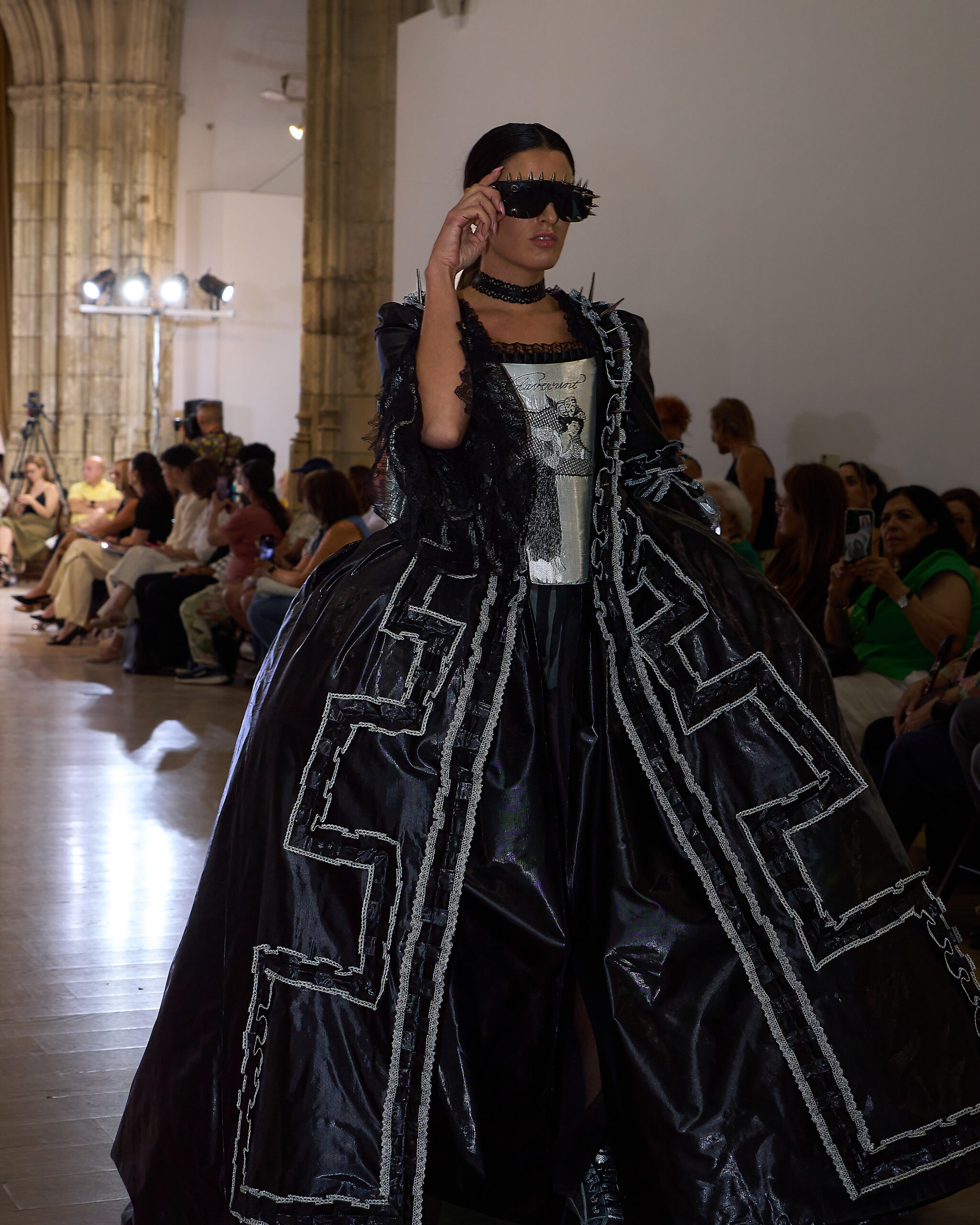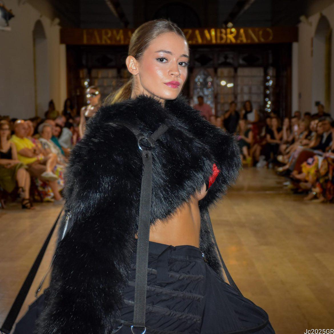 Fui seleccionada y presento mi primera colección VOLAVERUNT inspirada en Francisco De Goya, concretamente en su grabado “Volaverunt” y en la excelente visión cinematográfica de Bigas Luna, y la excelente interpretación de Aitana Sánchez Gijón. Es un homenaje a los comienzos de la liberación femenina y por ello una reverencia a todas las mujeres luchadoras a lo largo de la historia. Un viaje desde la opresión hacia el vuelo. Una colección que reinterpreta estructuras históricas a través de la energía del rock. Aquí, lo que antes limitaba ahora impulsa. Lo que aprisionaba, ahora libera. Volaverunt es fuerza, presencia y emancipación. Esta colección no decora, desobedece. No es moda, es resistencia vestida de arte.