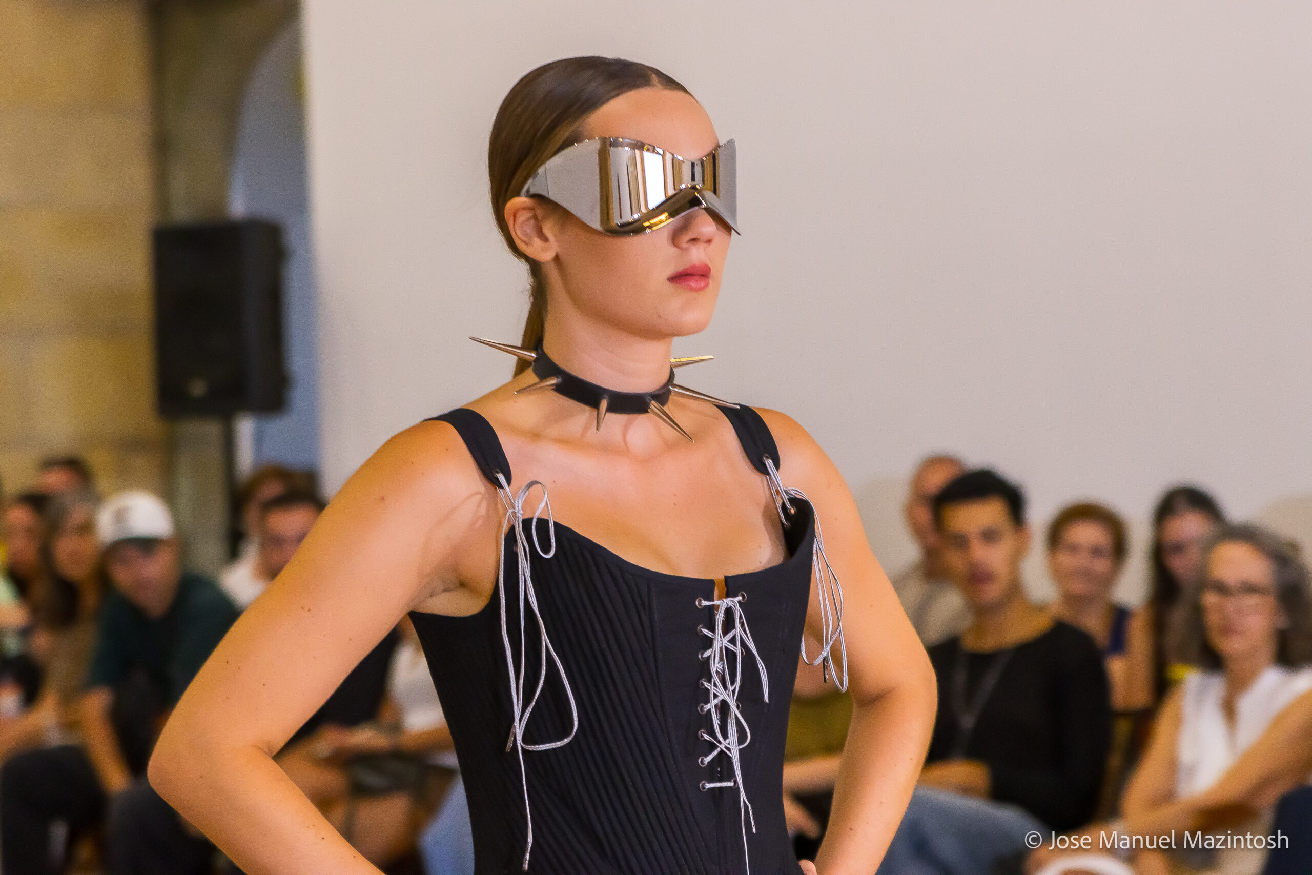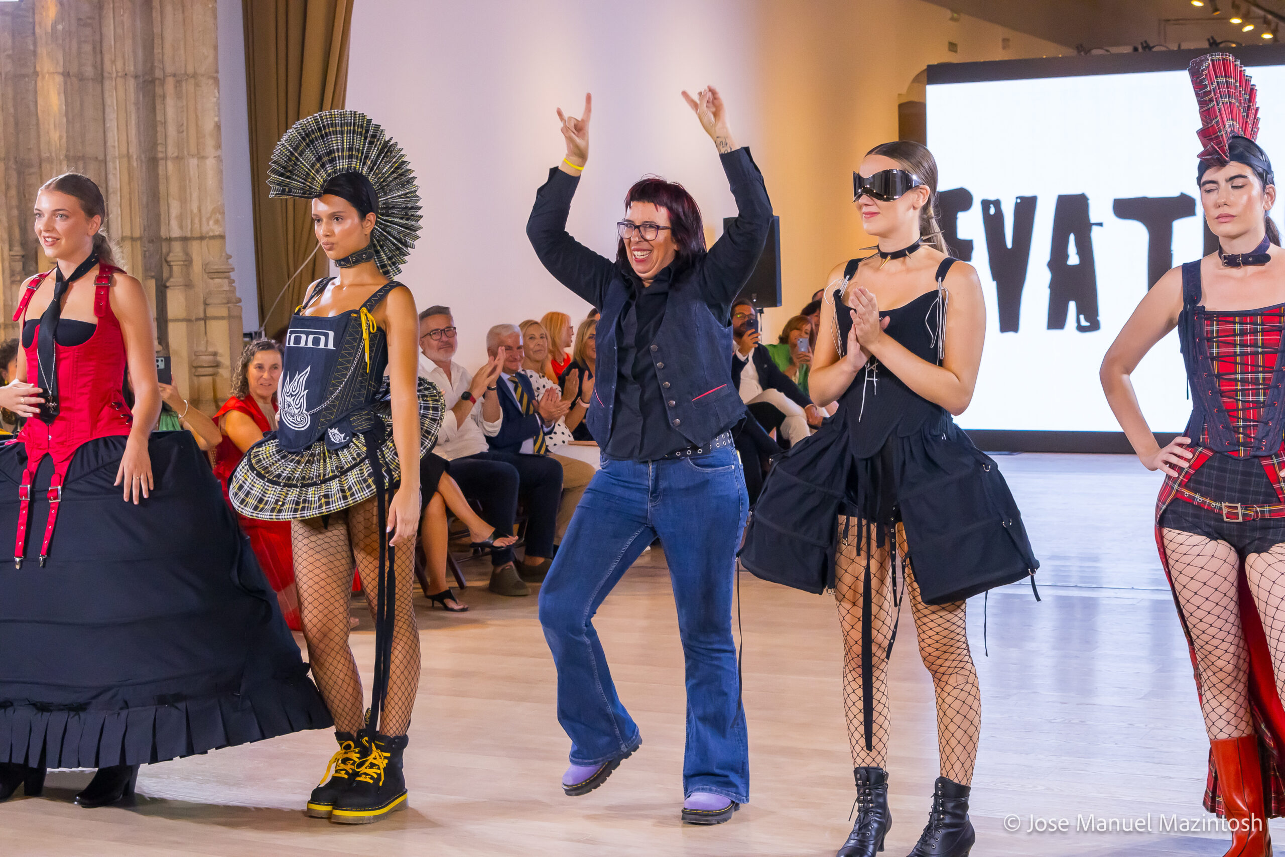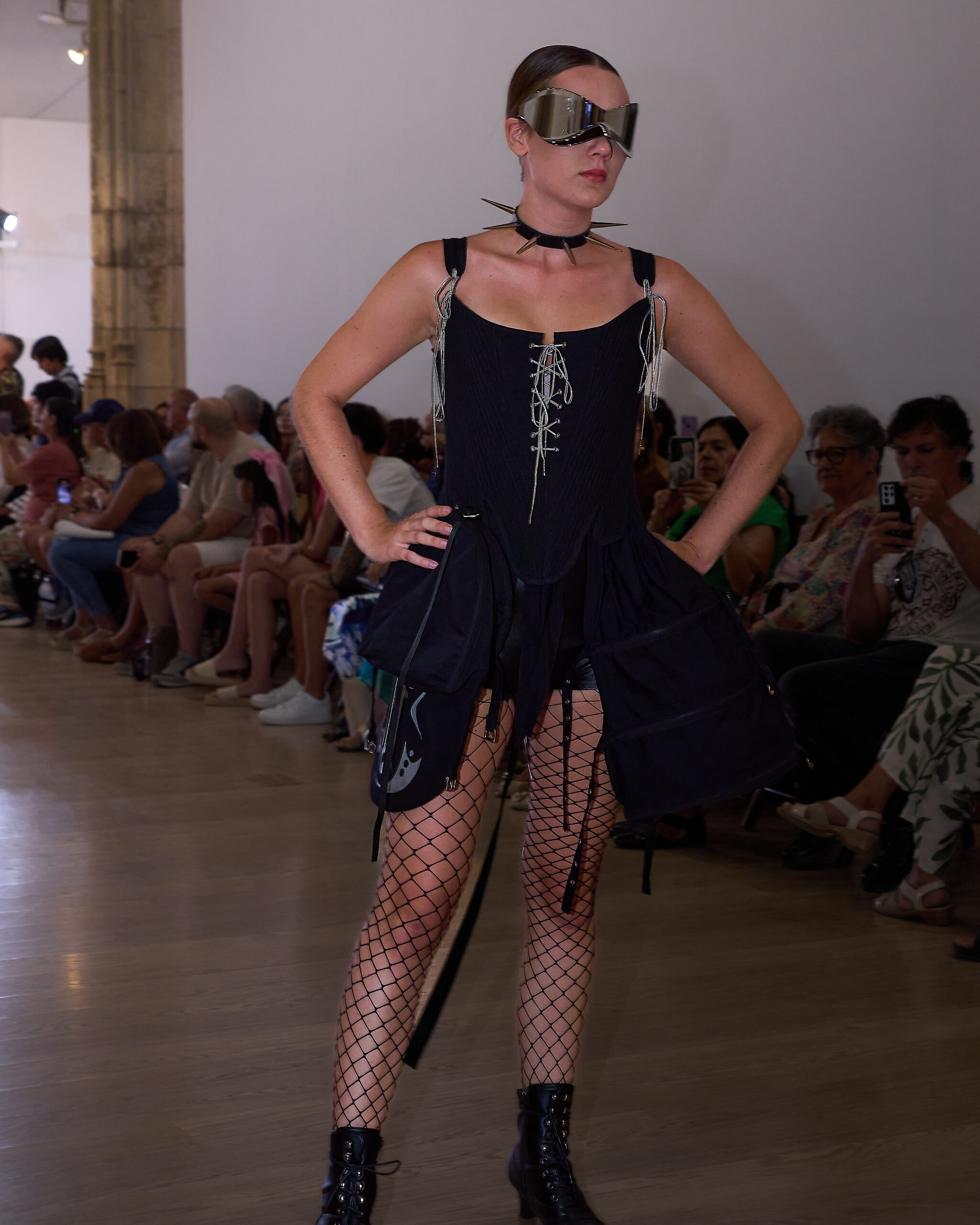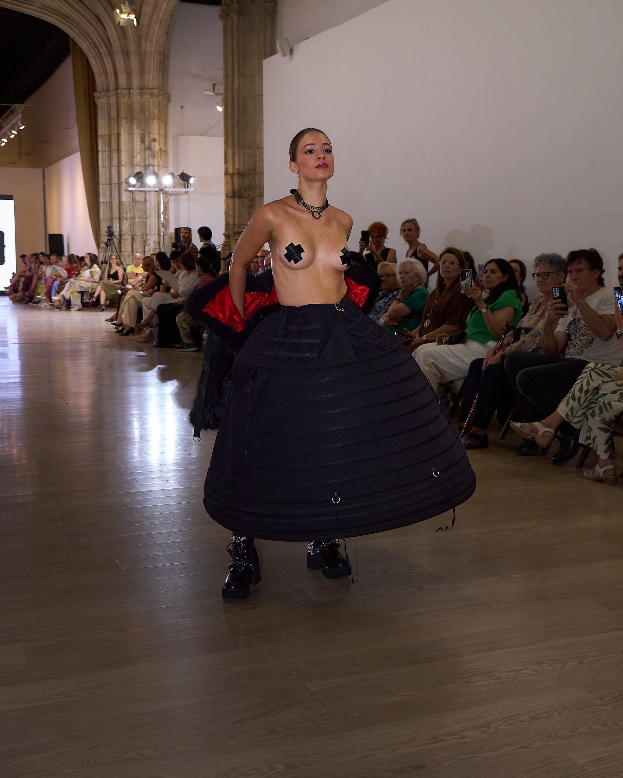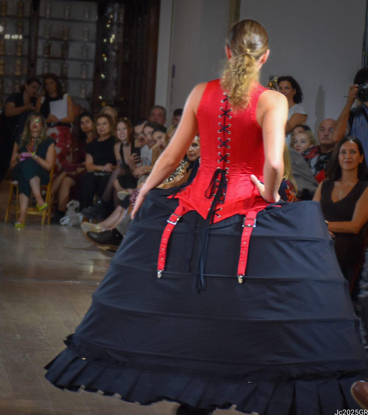 Fui seleccionada y presento mi primera colección VOLAVERUNT inspirada en Francisco De Goya, concretamente en su grabado “Volaverunt” y en la excelente visión cinematográfica de Bigas Luna, y la excelente interpretación de Aitana Sánchez Gijón. Es un homenaje a los comienzos de la liberación femenina y por ello una reverencia a todas las mujeres luchadoras a lo largo de la historia. Un viaje desde la opresión hacia el vuelo. Una colección que reinterpreta estructuras históricas a través de la energía del rock. Aquí, lo que antes limitaba ahora impulsa. Lo que aprisionaba, ahora libera. Volaverunt es fuerza, presencia y emancipación. Esta colección no decora, desobedece. No es moda, es resistencia vestida de arte.