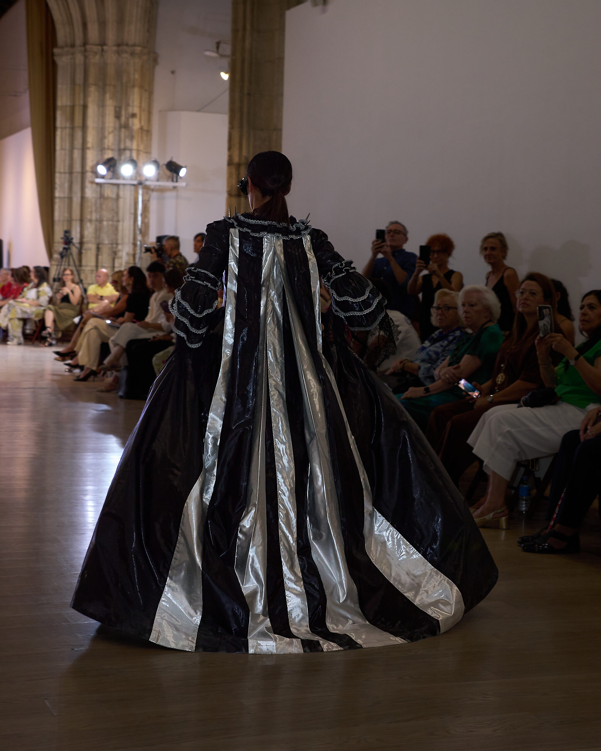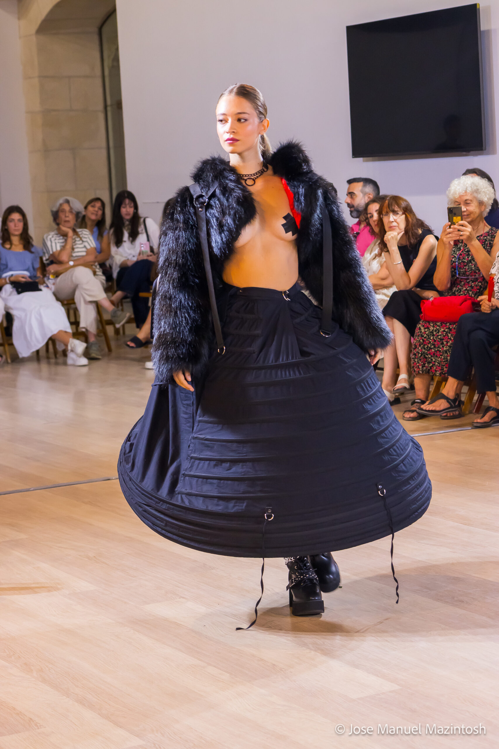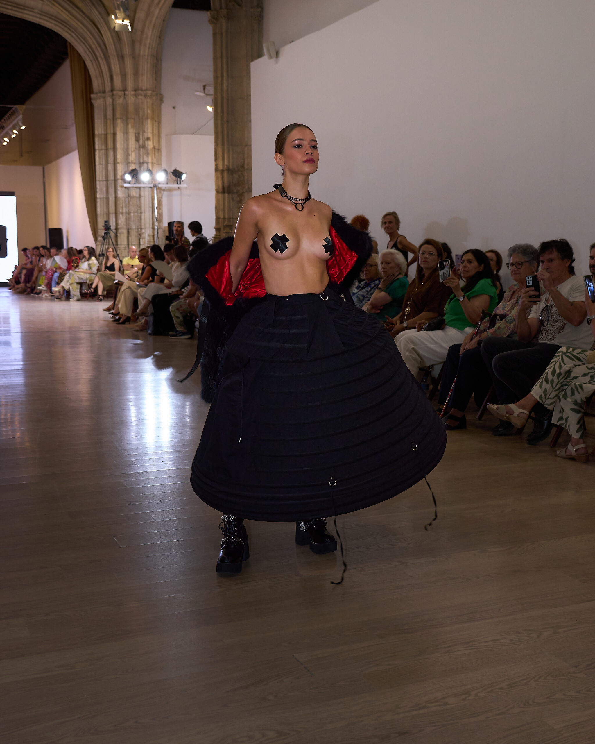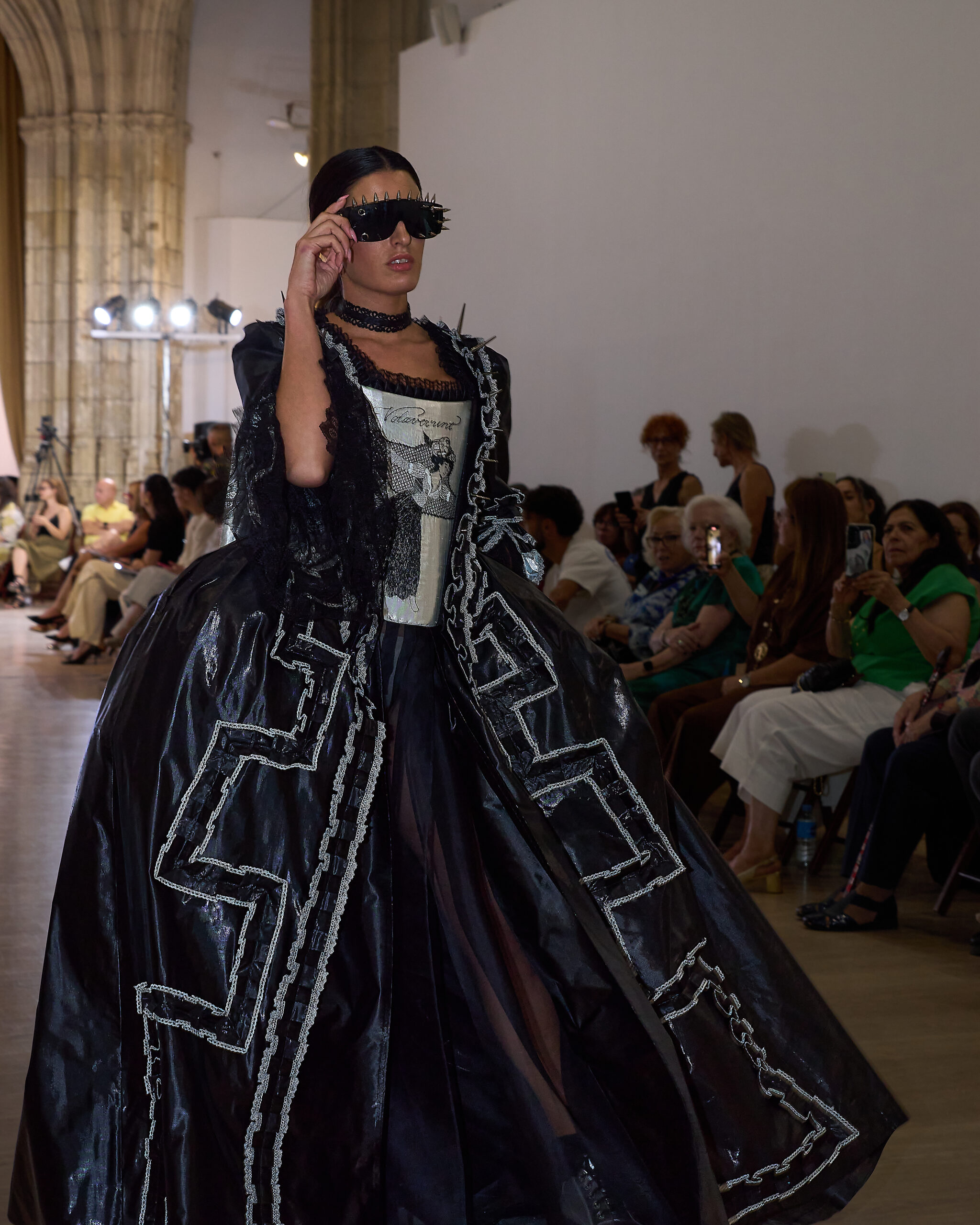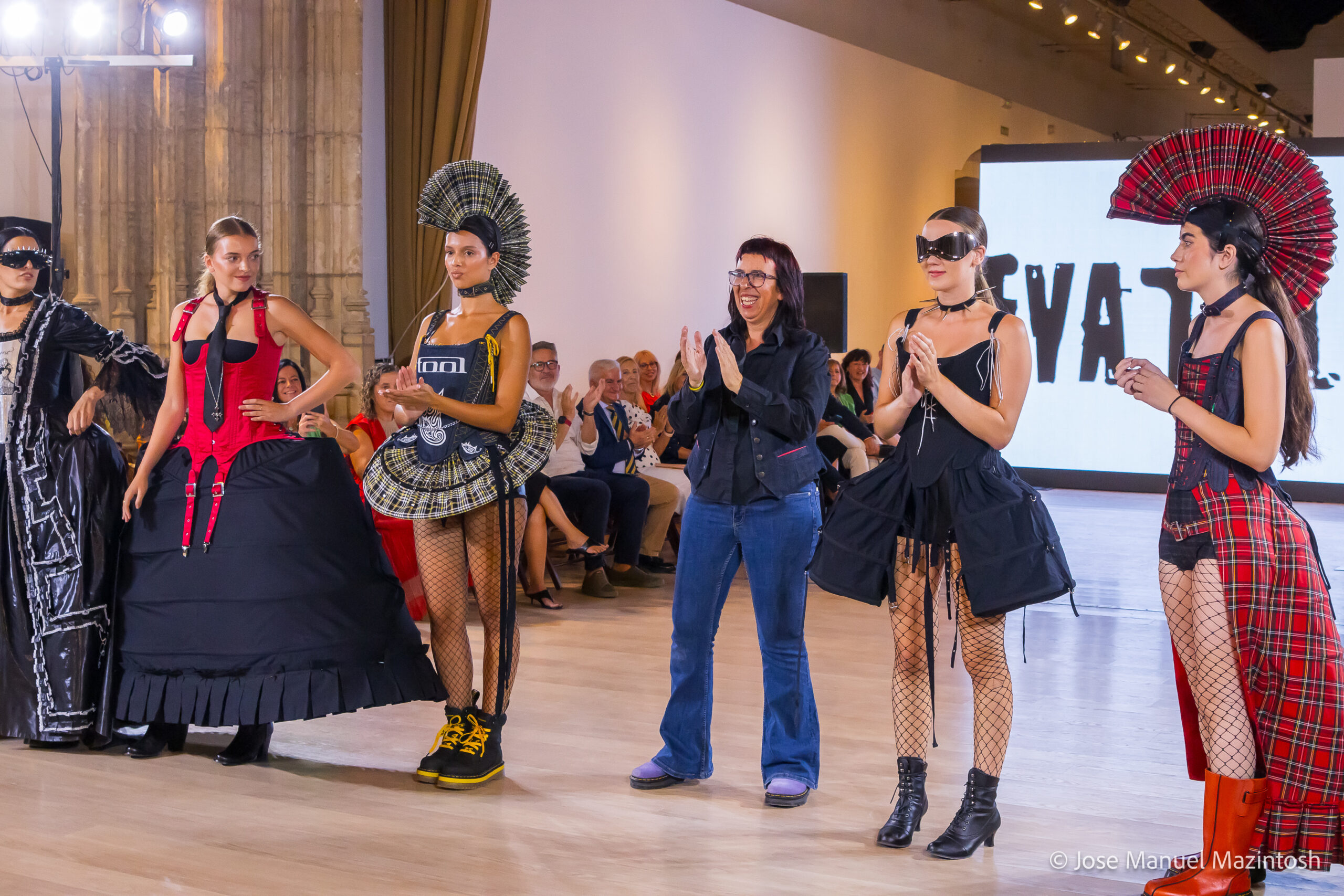 Fui seleccionada y presento mi primera colección VOLAVERUNT inspirada en Francisco De Goya, concretamente en su grabado “Volaverunt” y en la excelente visión cinematográfica de Bigas Luna, y la excelente interpretación de Aitana Sánchez Gijón. Es un homenaje a los comienzos de la liberación femenina y por ello una reverencia a todas las mujeres luchadoras a lo largo de la historia. Un viaje desde la opresión hacia el vuelo. Una colección que reinterpreta estructuras históricas a través de la energía del rock. Aquí, lo que antes limitaba ahora impulsa. Lo que aprisionaba, ahora libera. Volaverunt es fuerza, presencia y emancipación. Esta colección no decora, desobedece. No es moda, es resistencia vestida de arte.