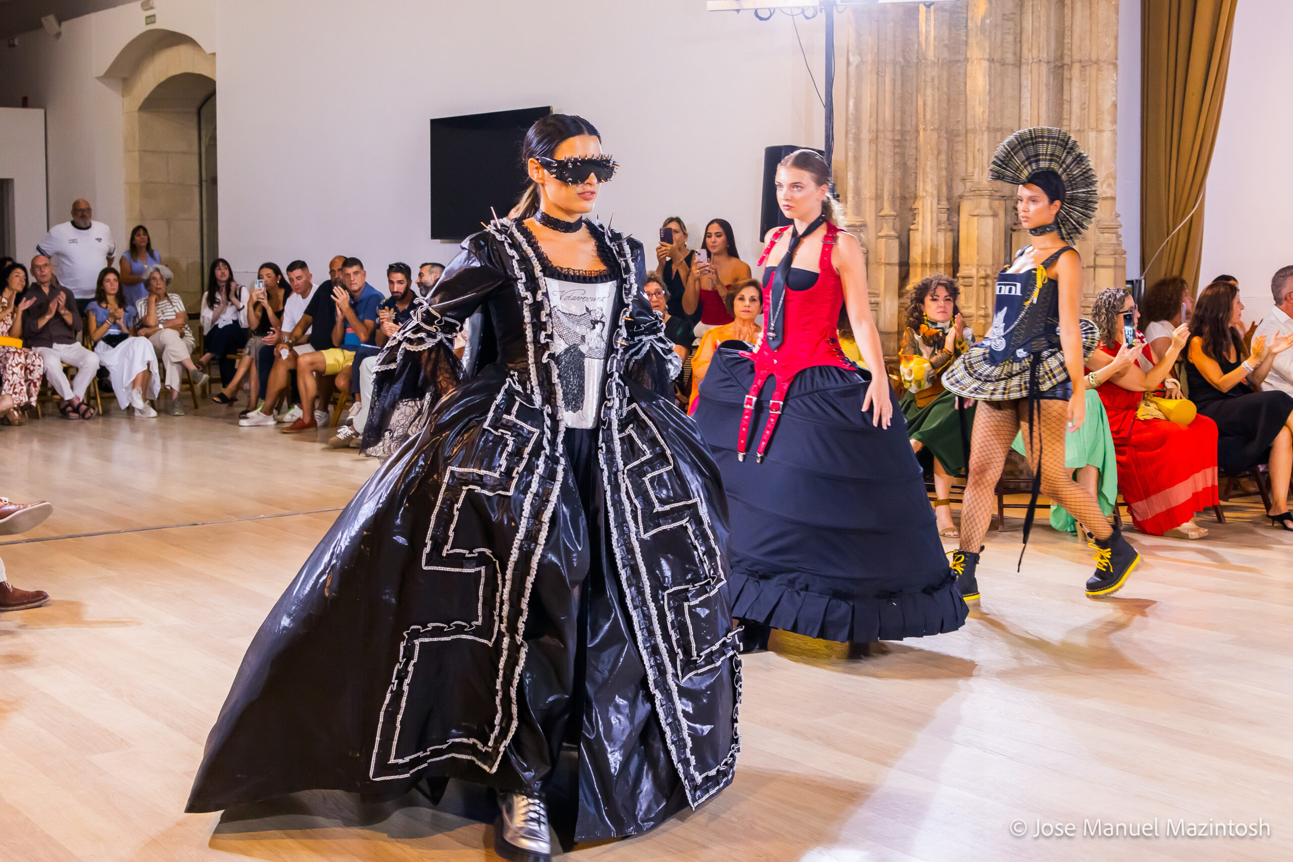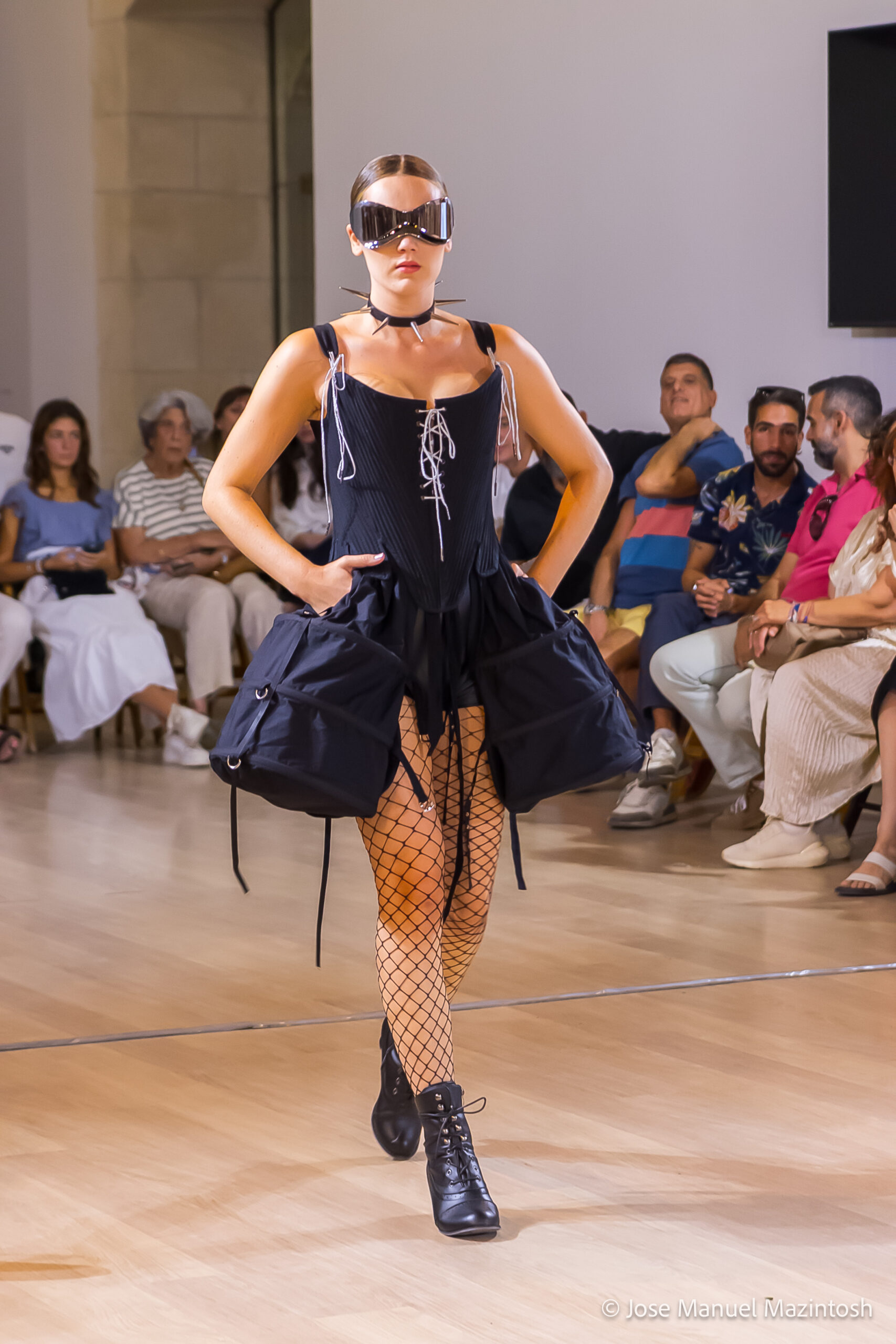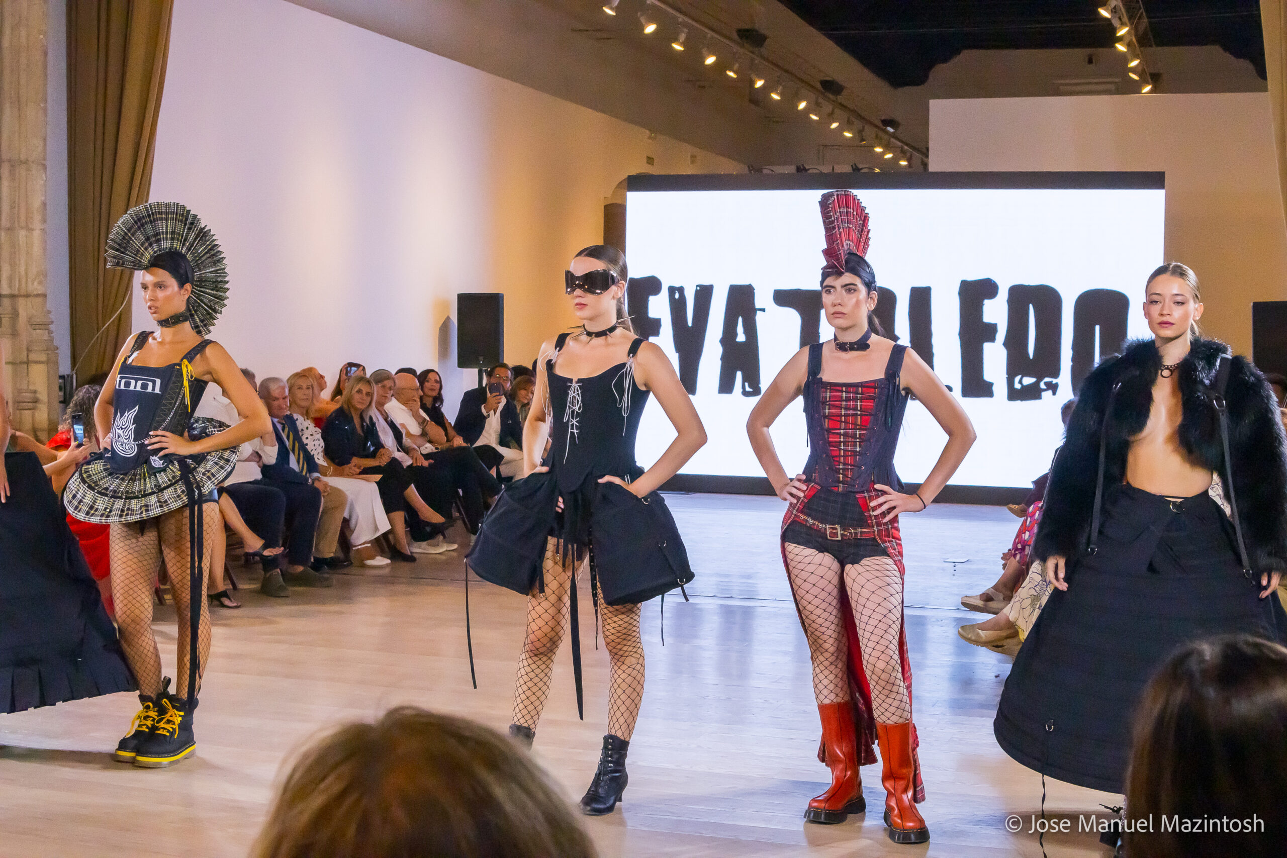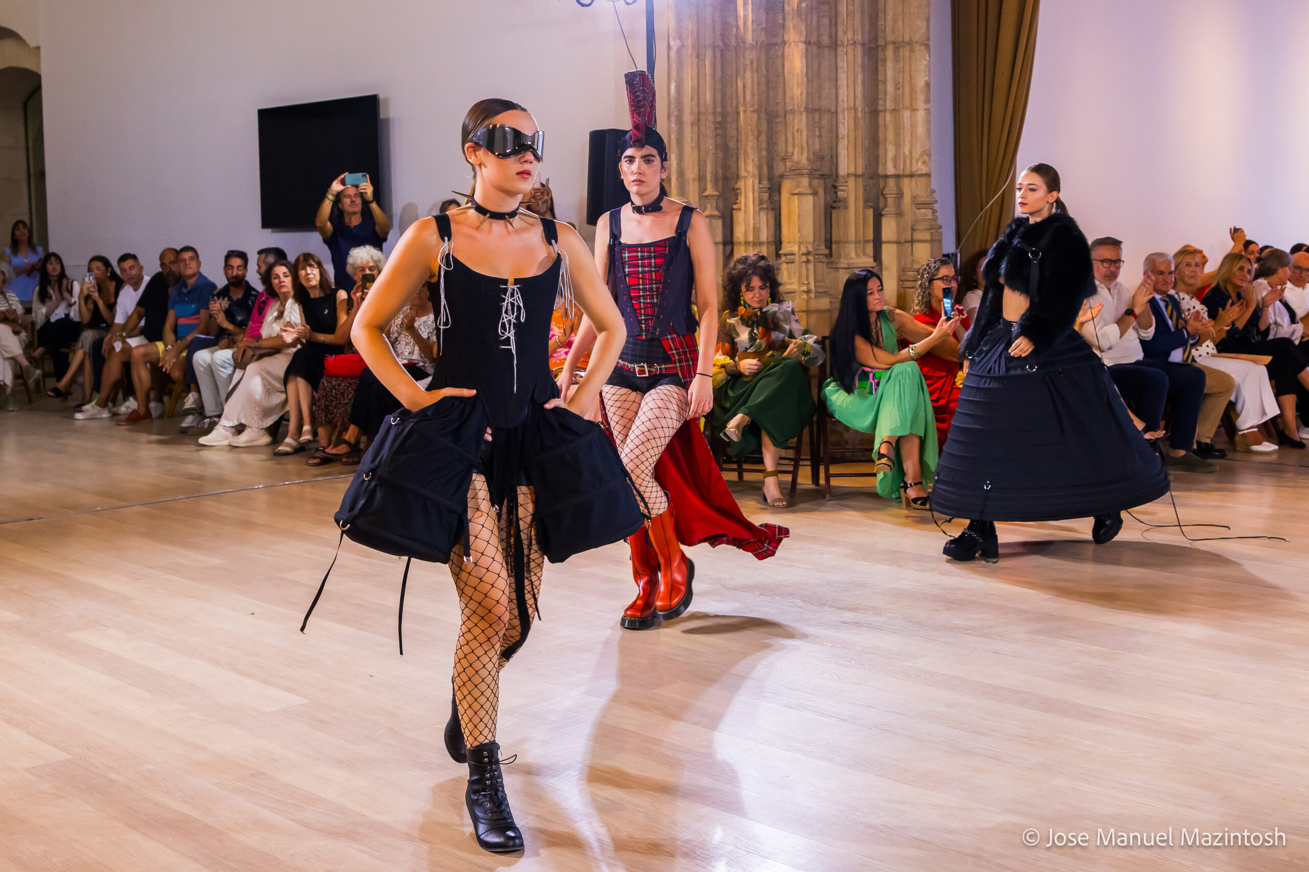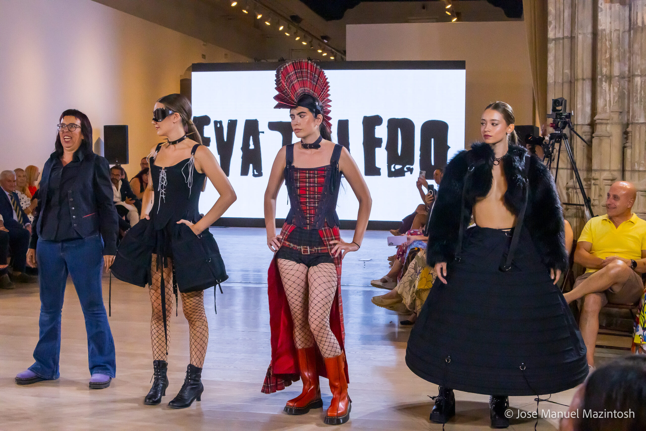 Fui seleccionada y presento mi primera colección VOLAVERUNT inspirada en Francisco De Goya, concretamente en su grabado “Volaverunt” y en la excelente visión cinematográfica de Bigas Luna, y la excelente interpretación de Aitana Sánchez Gijón. Es un homenaje a los comienzos de la liberación femenina y por ello una reverencia a todas las mujeres luchadoras a lo largo de la historia. Un viaje desde la opresión hacia el vuelo. Una colección que reinterpreta estructuras históricas a través de la energía del rock. Aquí, lo que antes limitaba ahora impulsa. Lo que aprisionaba, ahora libera. Volaverunt es fuerza, presencia y emancipación. Esta colección no decora, desobedece. No es moda, es resistencia vestida de arte.