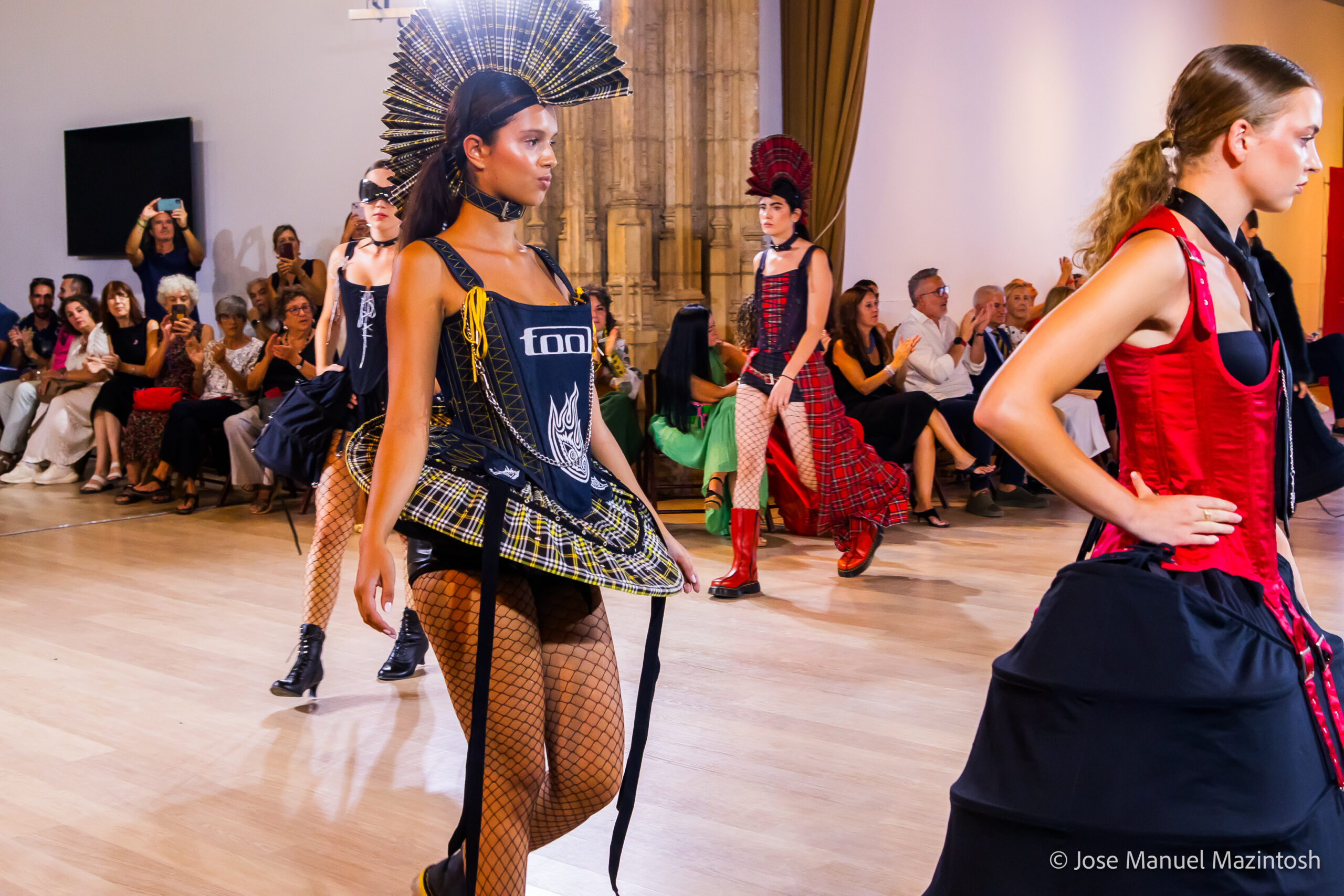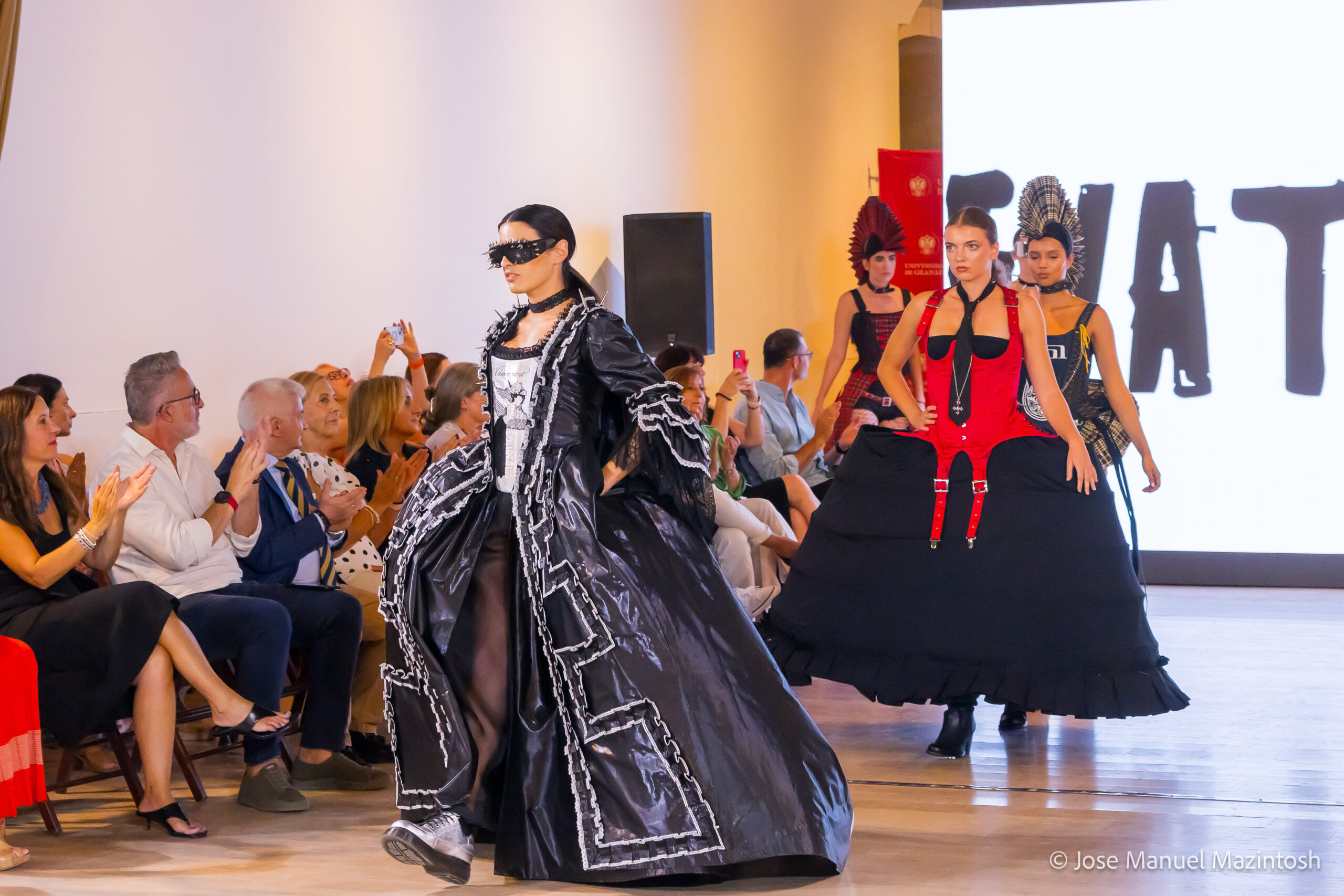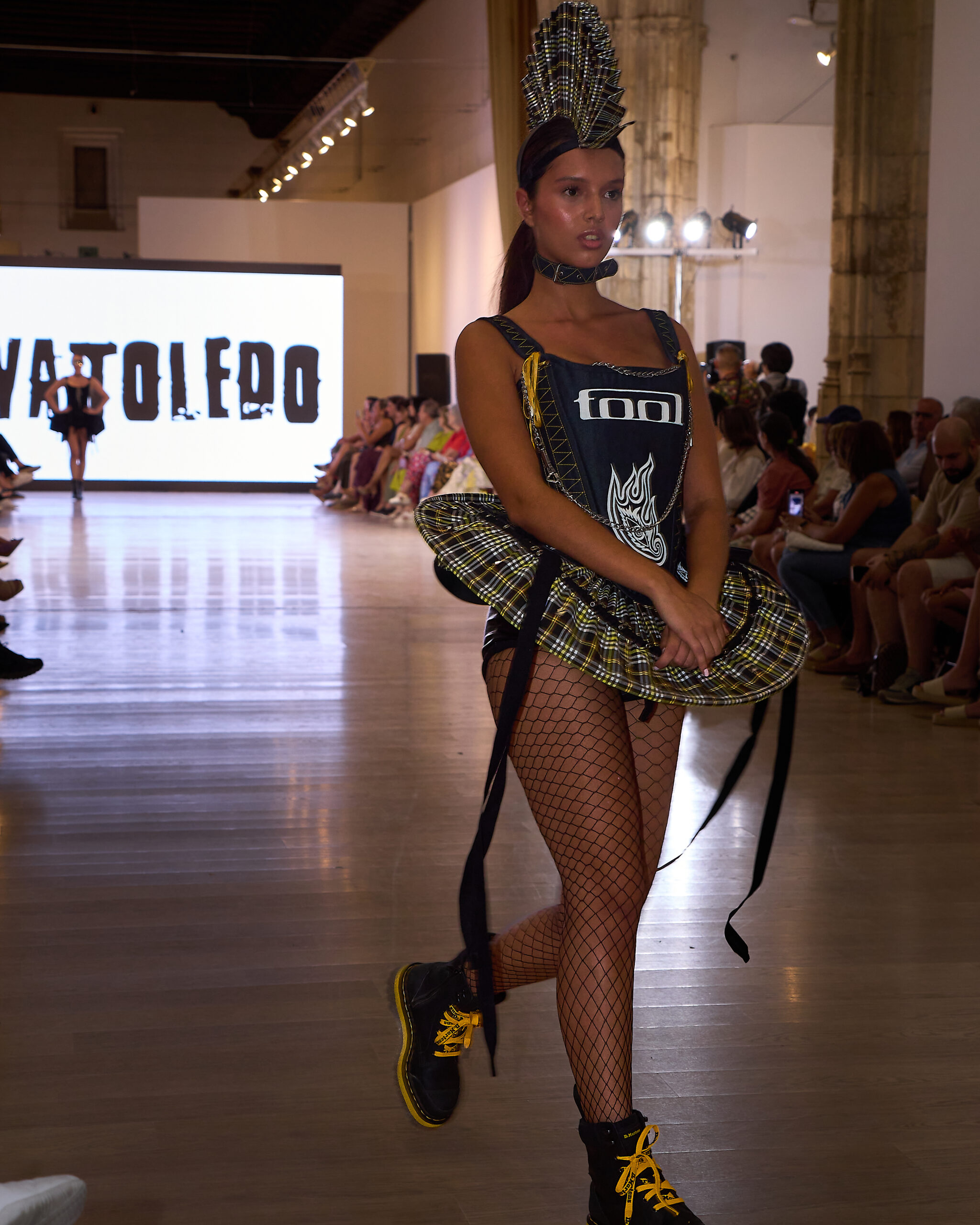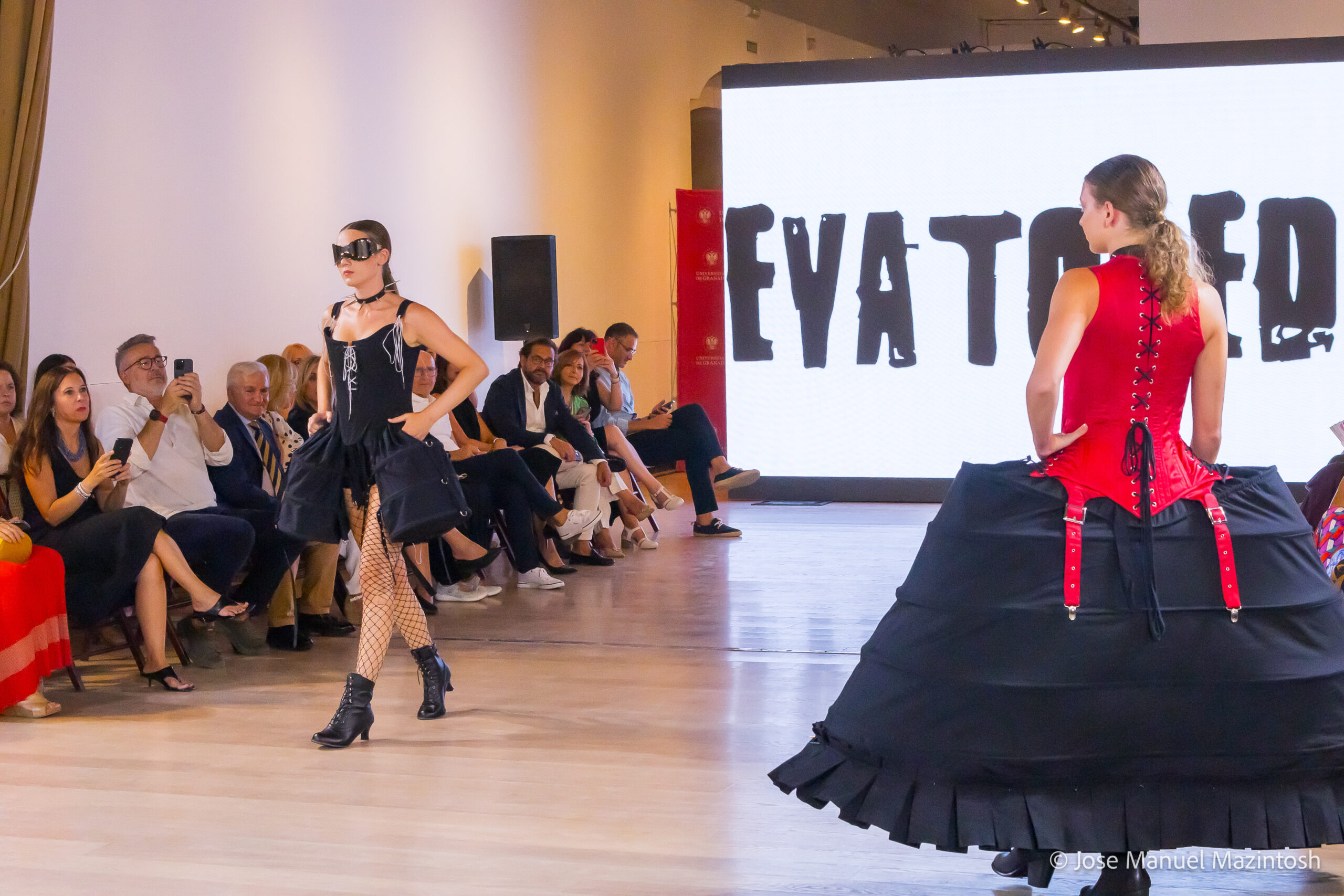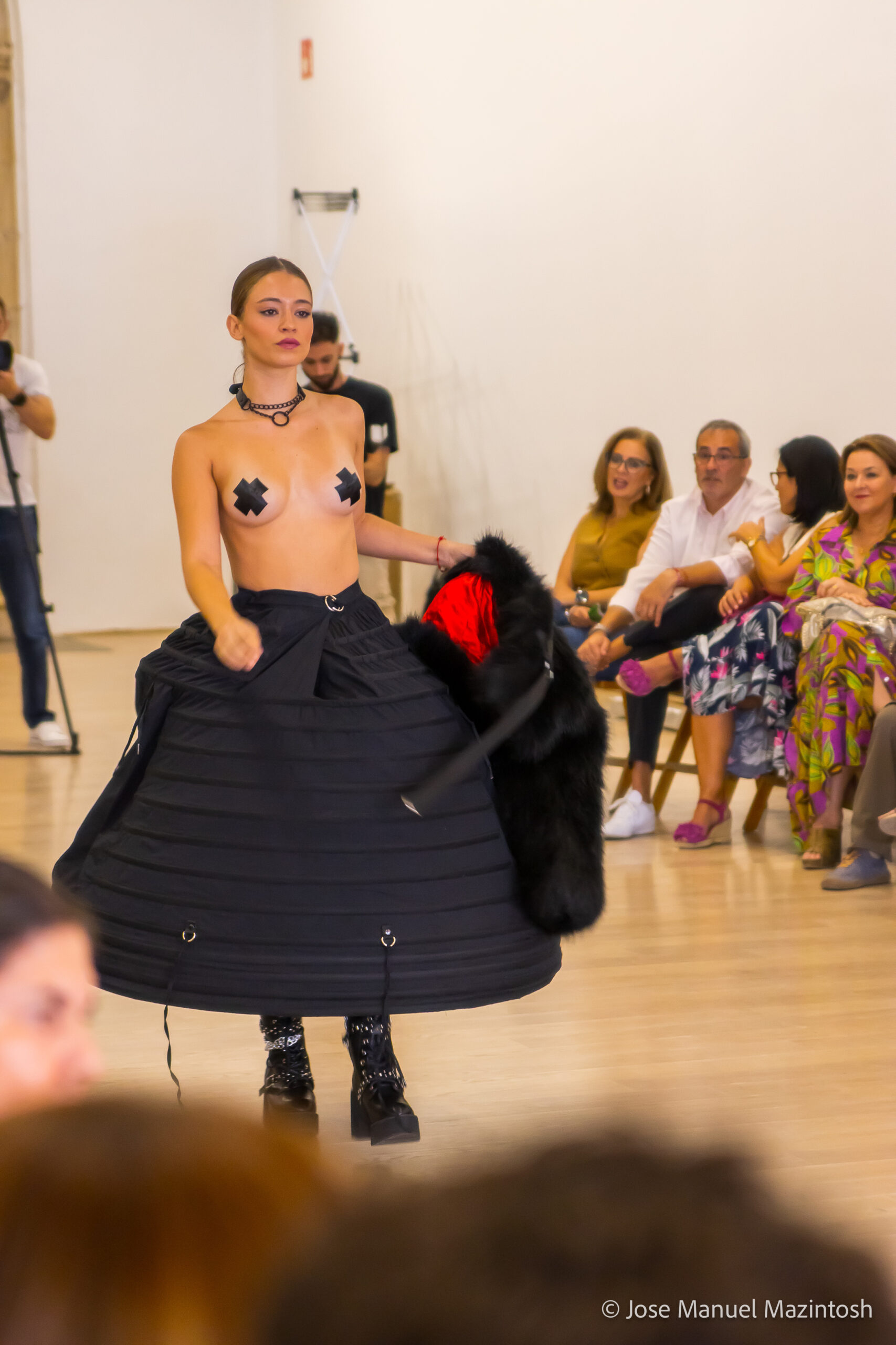 Fui seleccionada y presento mi primera colección VOLAVERUNT inspirada en Francisco De Goya, concretamente en su grabado “Volaverunt” y en la excelente visión cinematográfica de Bigas Luna, y la excelente interpretación de Aitana Sánchez Gijón. Es un homenaje a los comienzos de la liberación femenina y por ello una reverencia a todas las mujeres luchadoras a lo largo de la historia. Un viaje desde la opresión hacia el vuelo. Una colección que reinterpreta estructuras históricas a través de la energía del rock. Aquí, lo que antes limitaba ahora impulsa. Lo que aprisionaba, ahora libera. Volaverunt es fuerza, presencia y emancipación. Esta colección no decora, desobedece. No es moda, es resistencia vestida de arte.