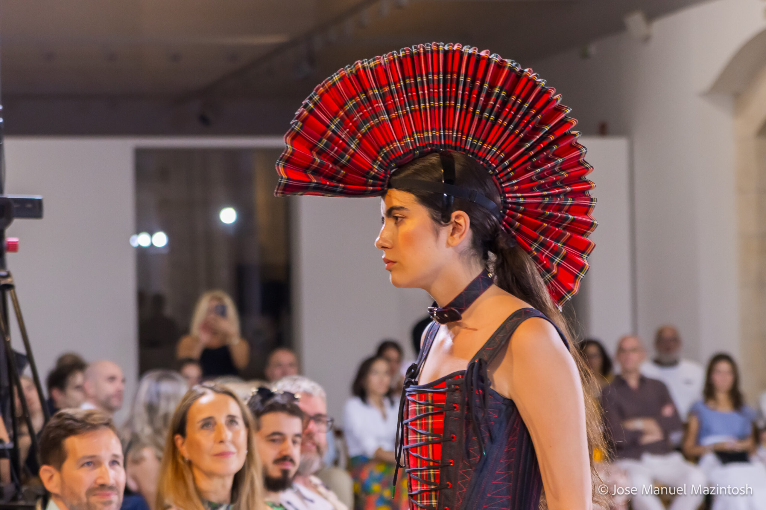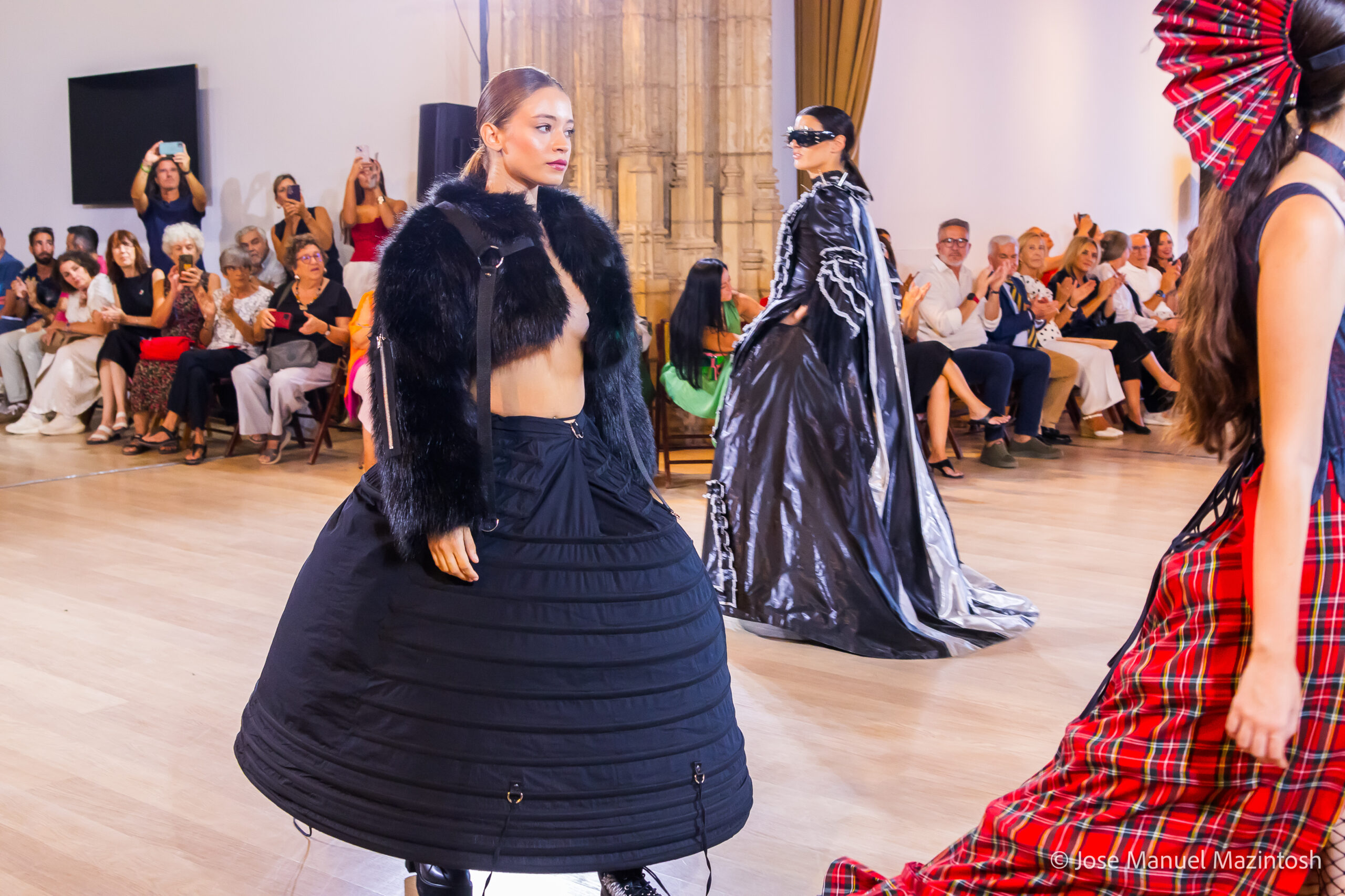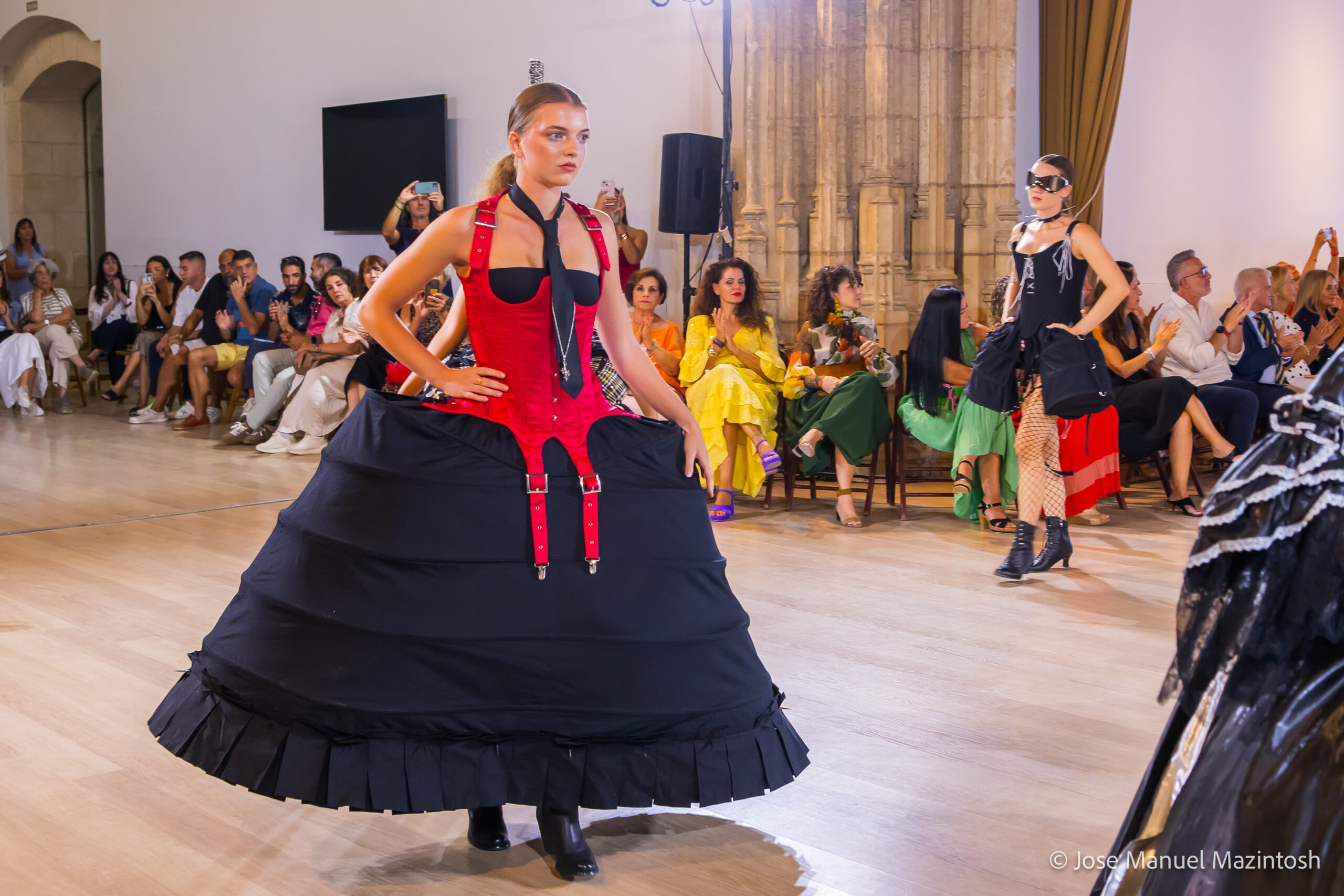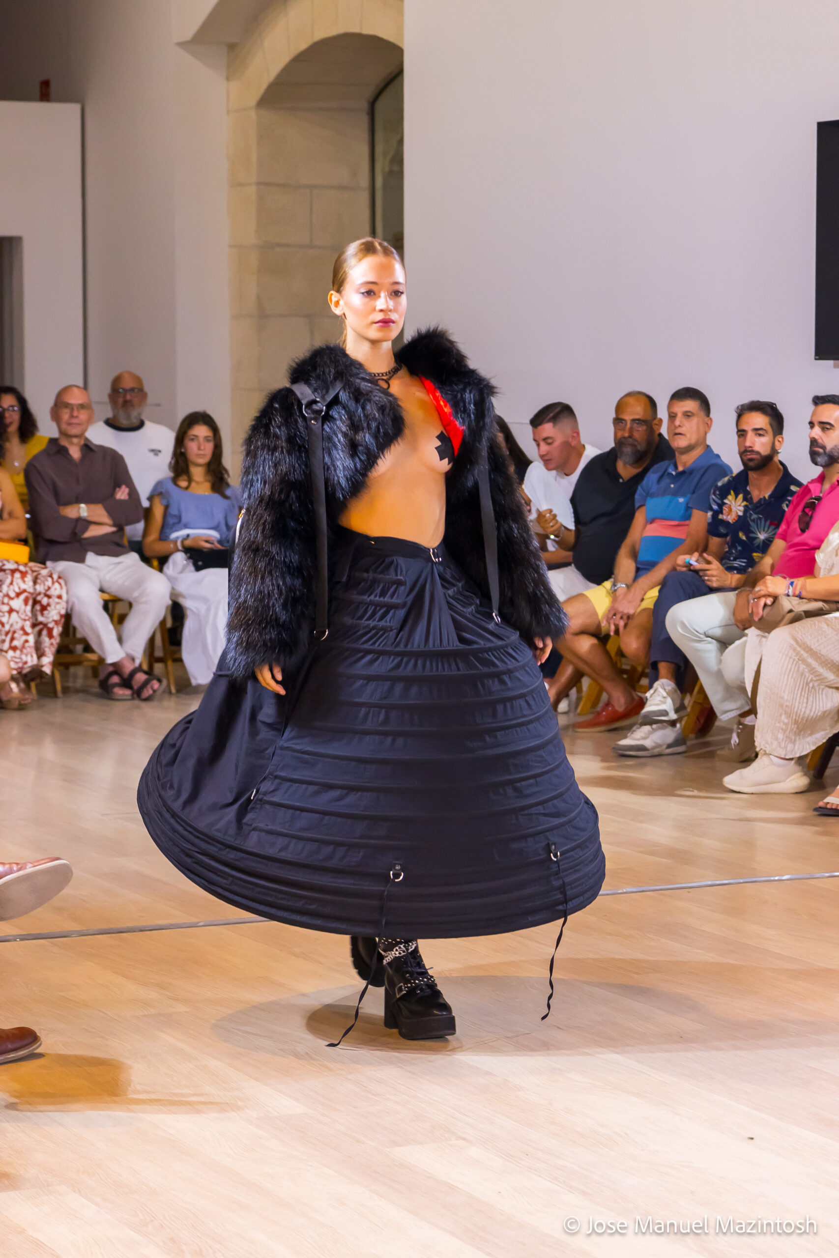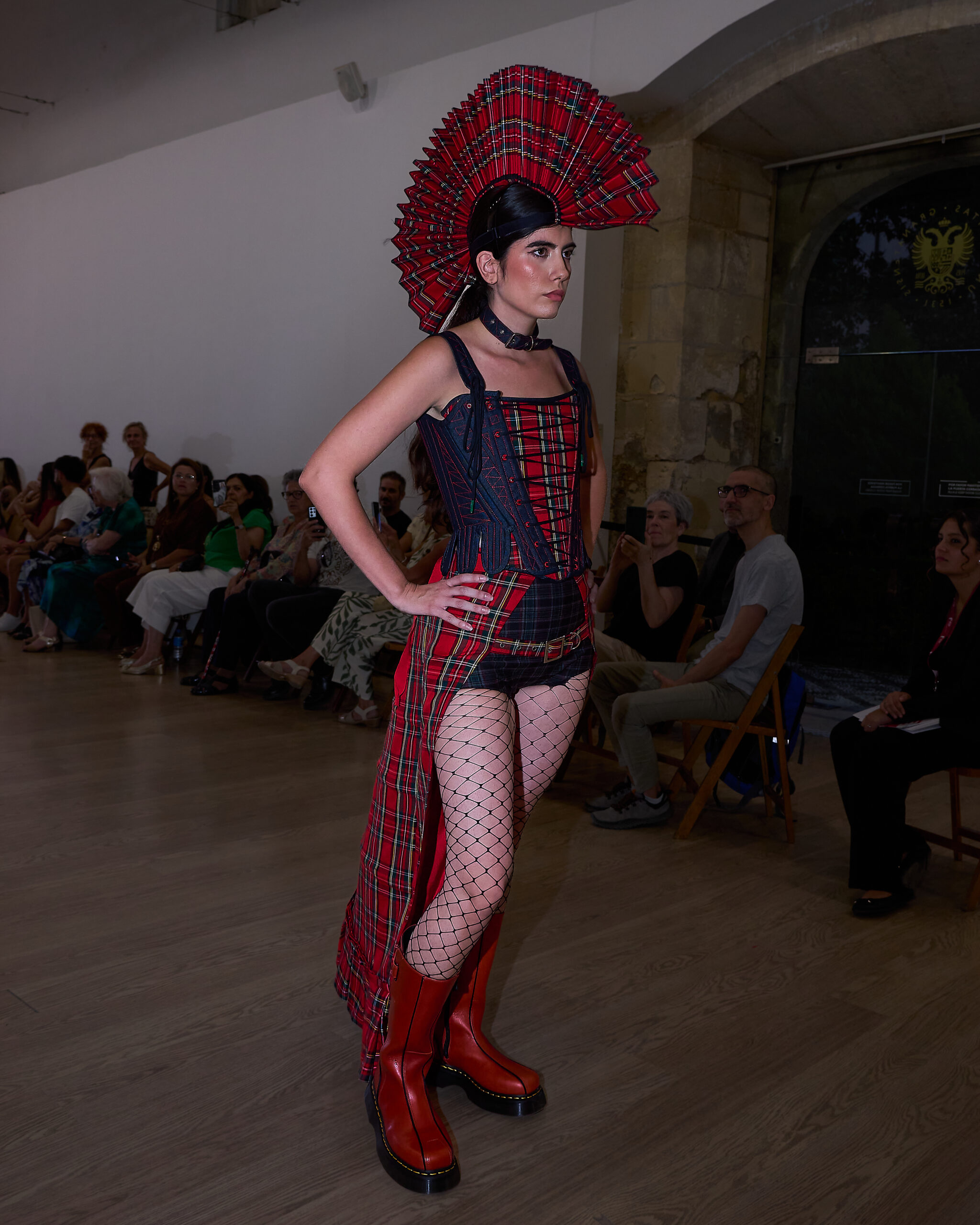 Fui seleccionada y presento mi primera colección VOLAVERUNT inspirada en Francisco De Goya, concretamente en su grabado “Volaverunt” y en la excelente visión cinematográfica de Bigas Luna, y la excelente interpretación de Aitana Sánchez Gijón. Es un homenaje a los comienzos de la liberación femenina y por ello una reverencia a todas las mujeres luchadoras a lo largo de la historia. Un viaje desde la opresión hacia el vuelo. Una colección que reinterpreta estructuras históricas a través de la energía del rock. Aquí, lo que antes limitaba ahora impulsa. Lo que aprisionaba, ahora libera. Volaverunt es fuerza, presencia y emancipación. Esta colección no decora, desobedece. No es moda, es resistencia vestida de arte.