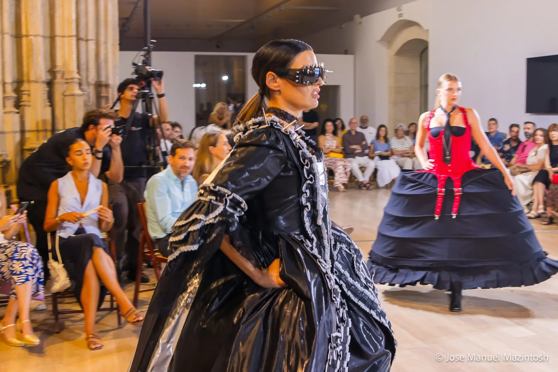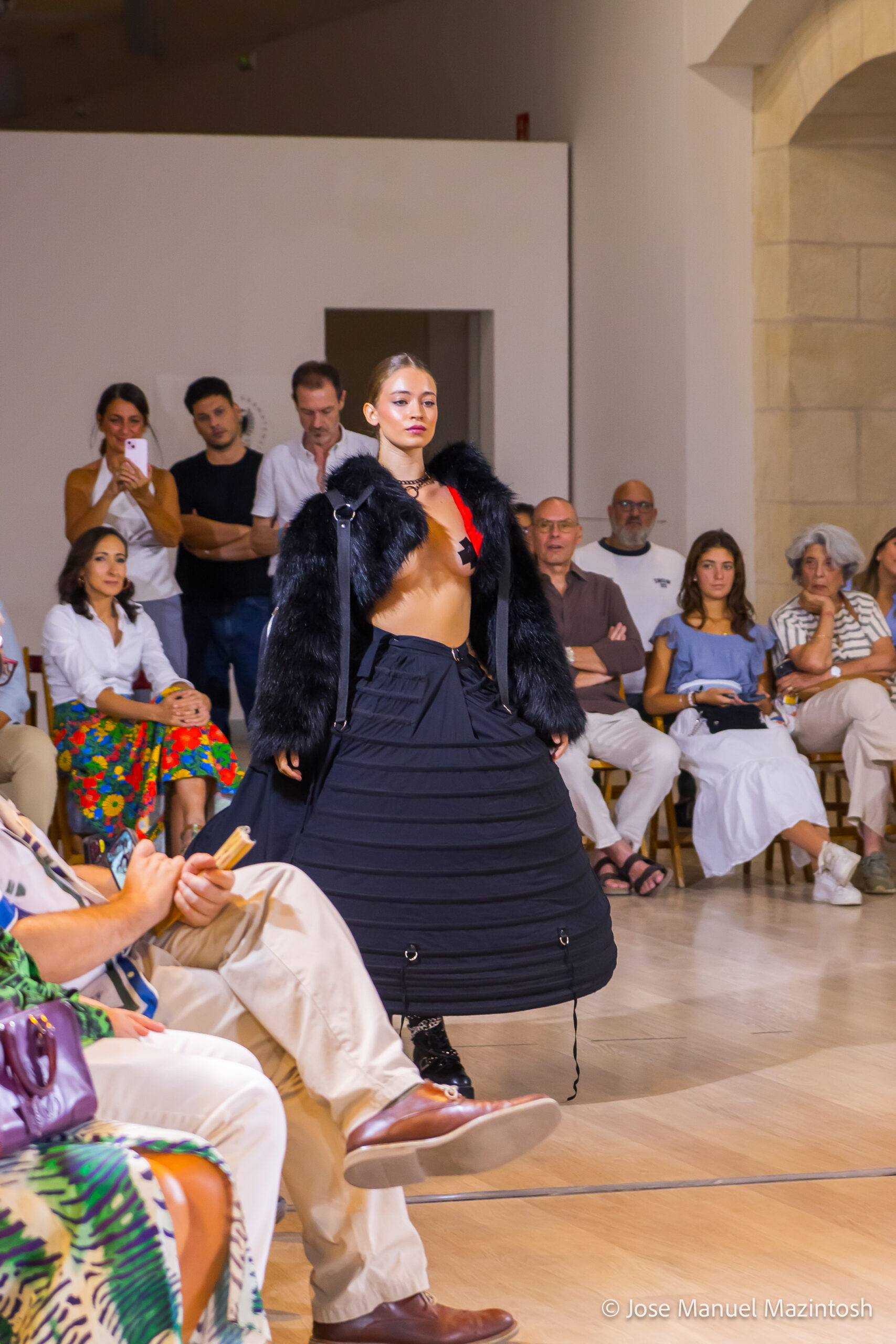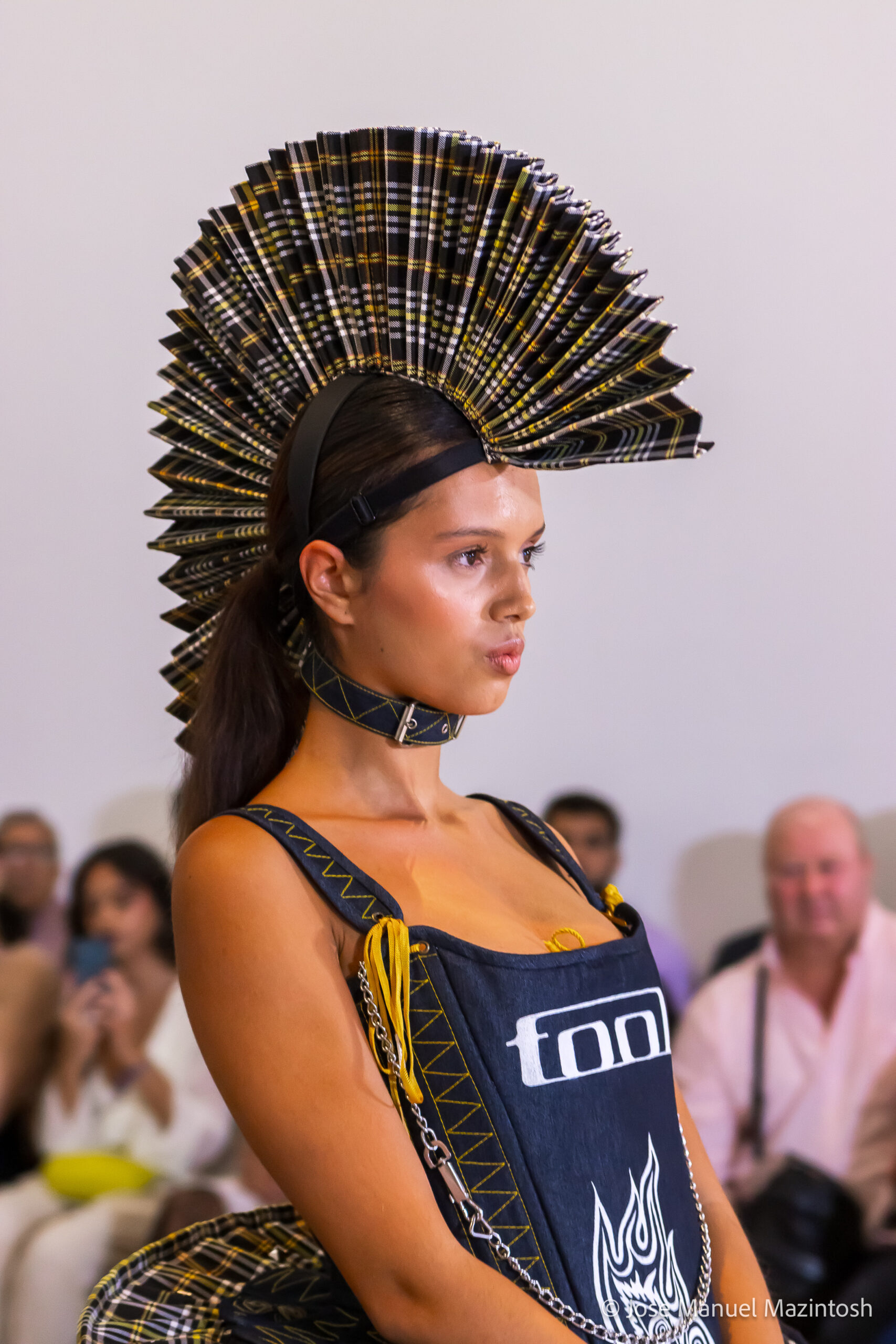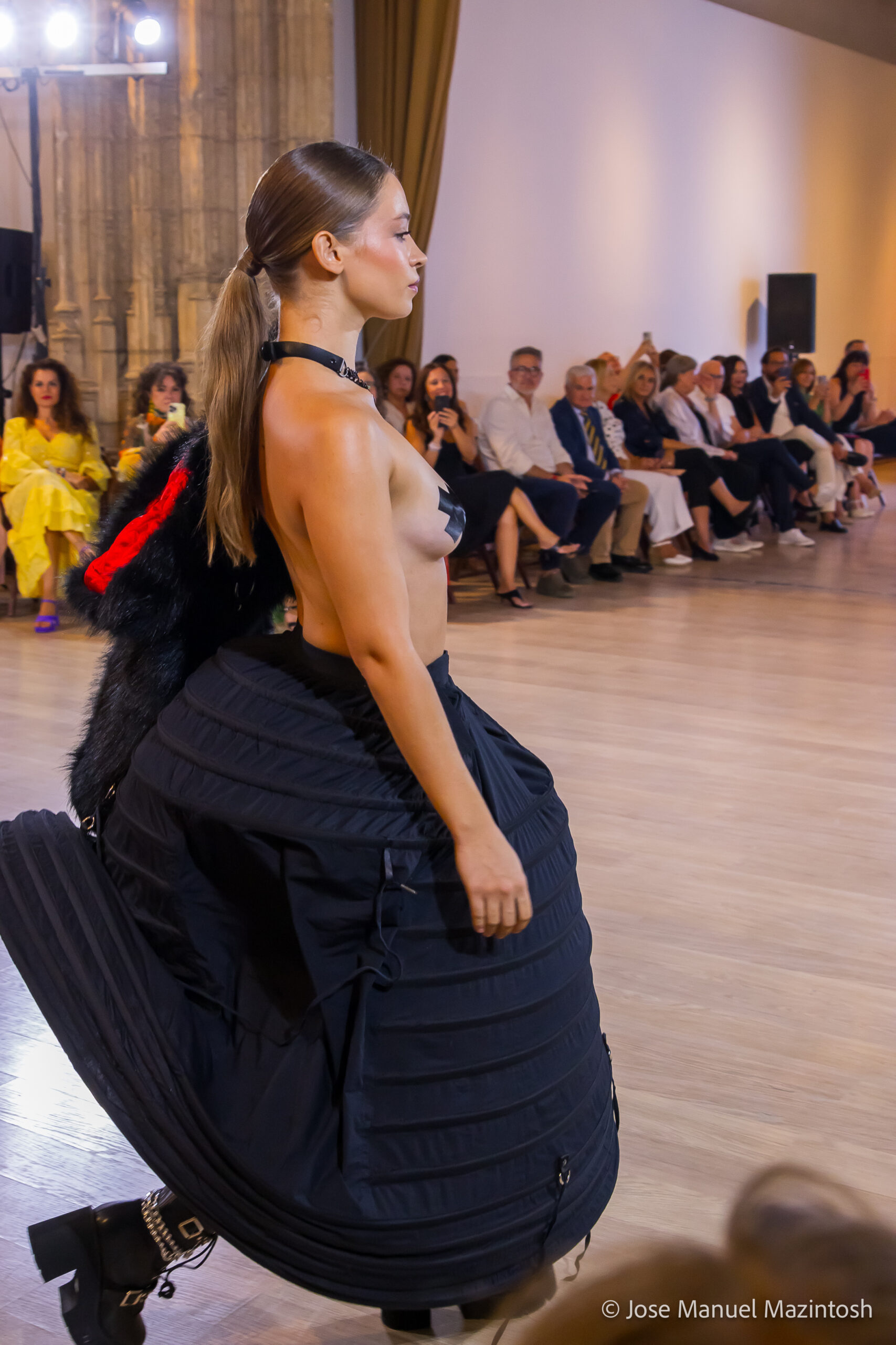 Fui seleccionada y presento mi primera colección VOLAVERUNT inspirada en Francisco De Goya, concretamente en su grabado “Volaverunt” y en la excelente visión cinematográfica de Bigas Luna, y la excelente interpretación de Aitana Sánchez Gijón. Es un homenaje a los comienzos de la liberación femenina y por ello una reverencia a todas las mujeres luchadoras a lo largo de la historia. Un viaje desde la opresión hacia el vuelo. Una colección que reinterpreta estructuras históricas a través de la energía del rock. Aquí, lo que antes limitaba ahora impulsa. Lo que aprisionaba, ahora libera. Volaverunt es fuerza, presencia y emancipación. Esta colección no decora, desobedece. No es moda, es resistencia vestida de arte.