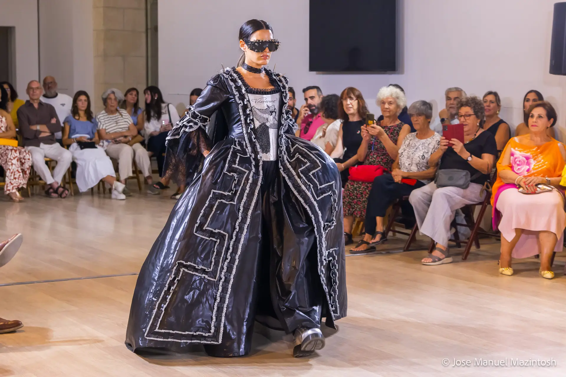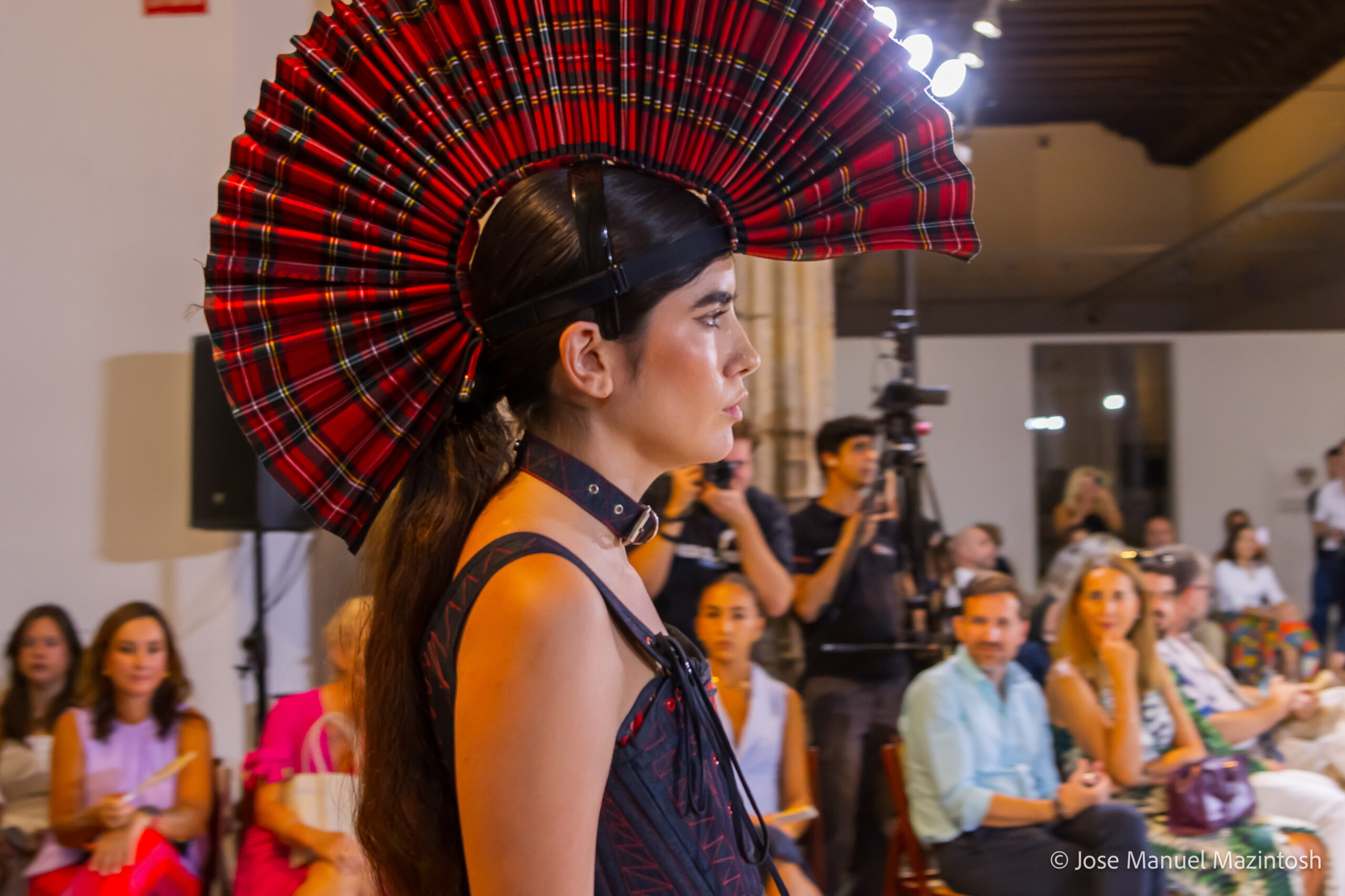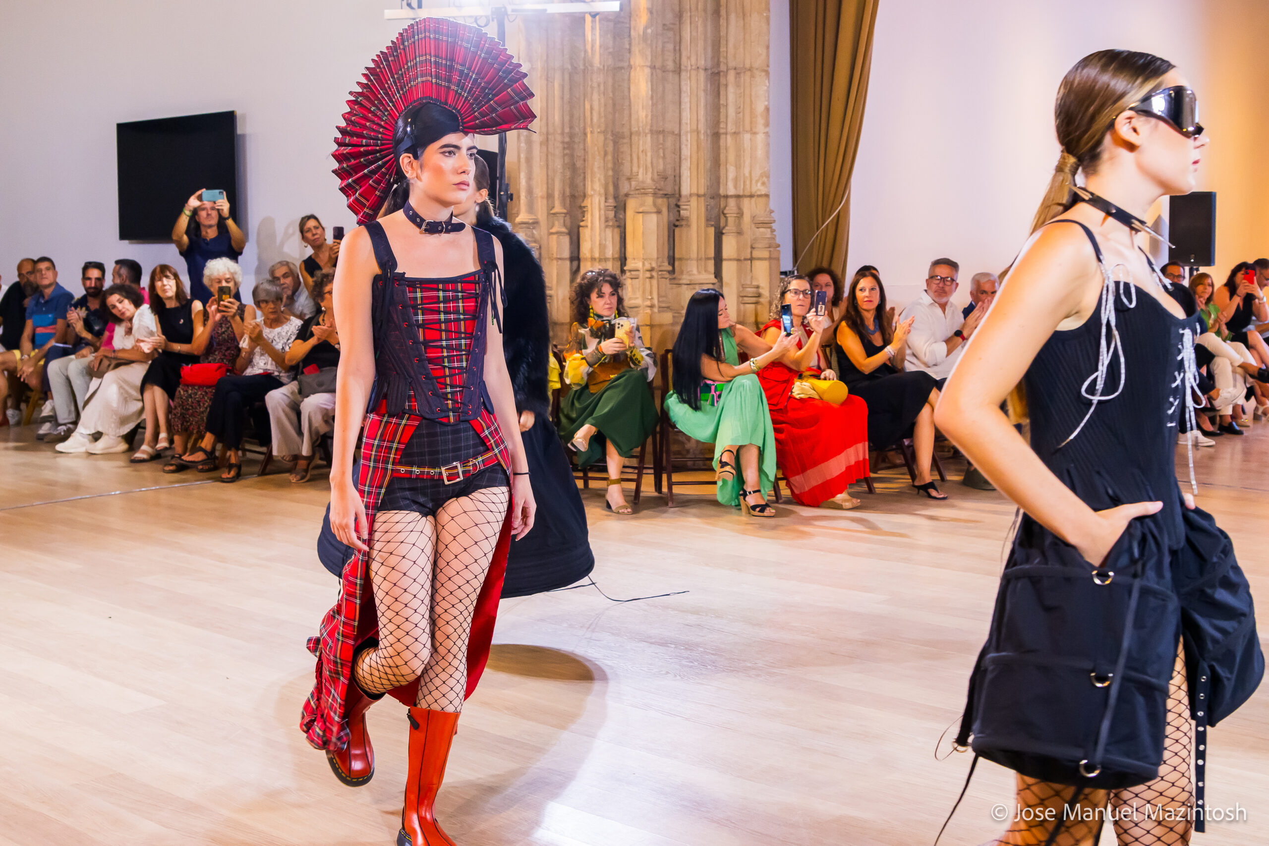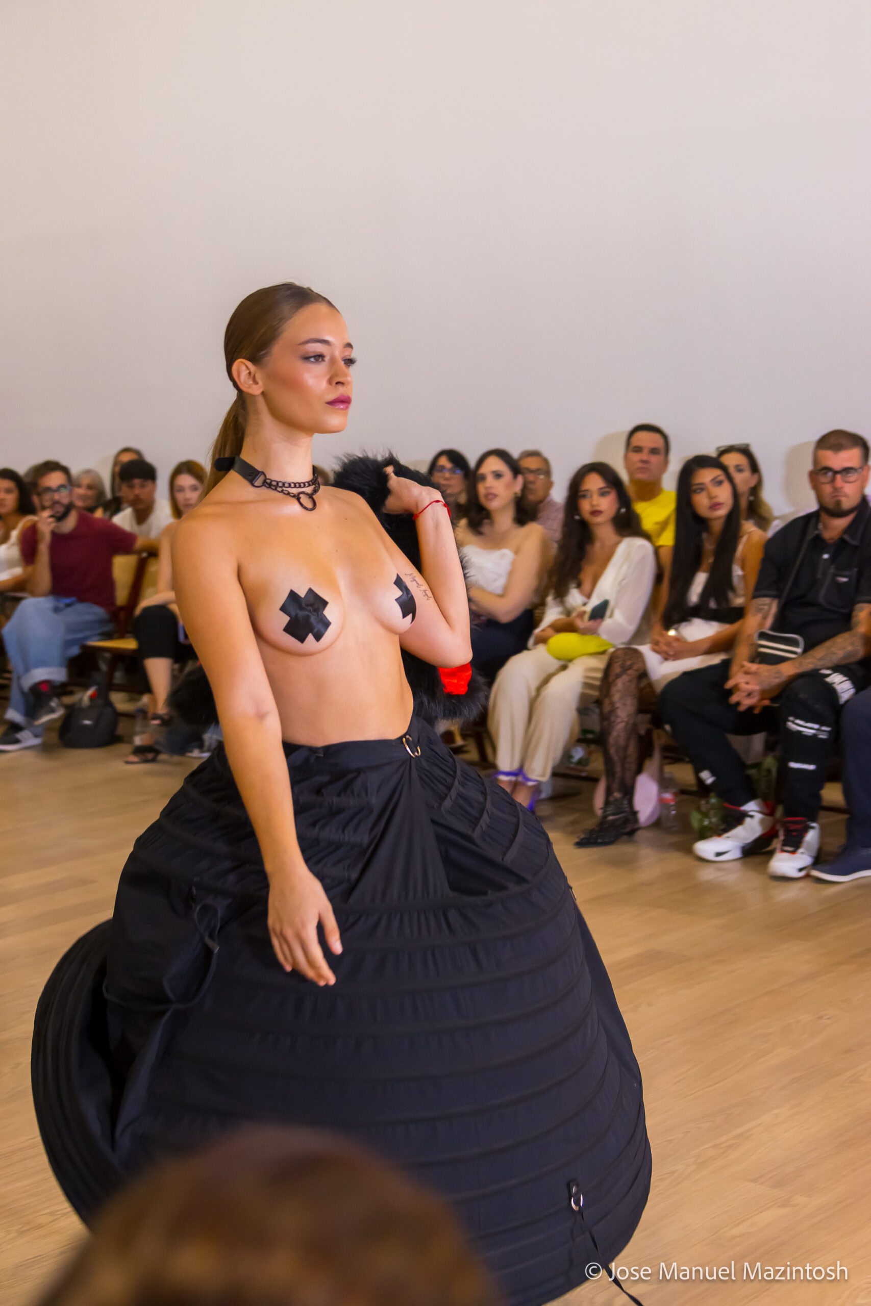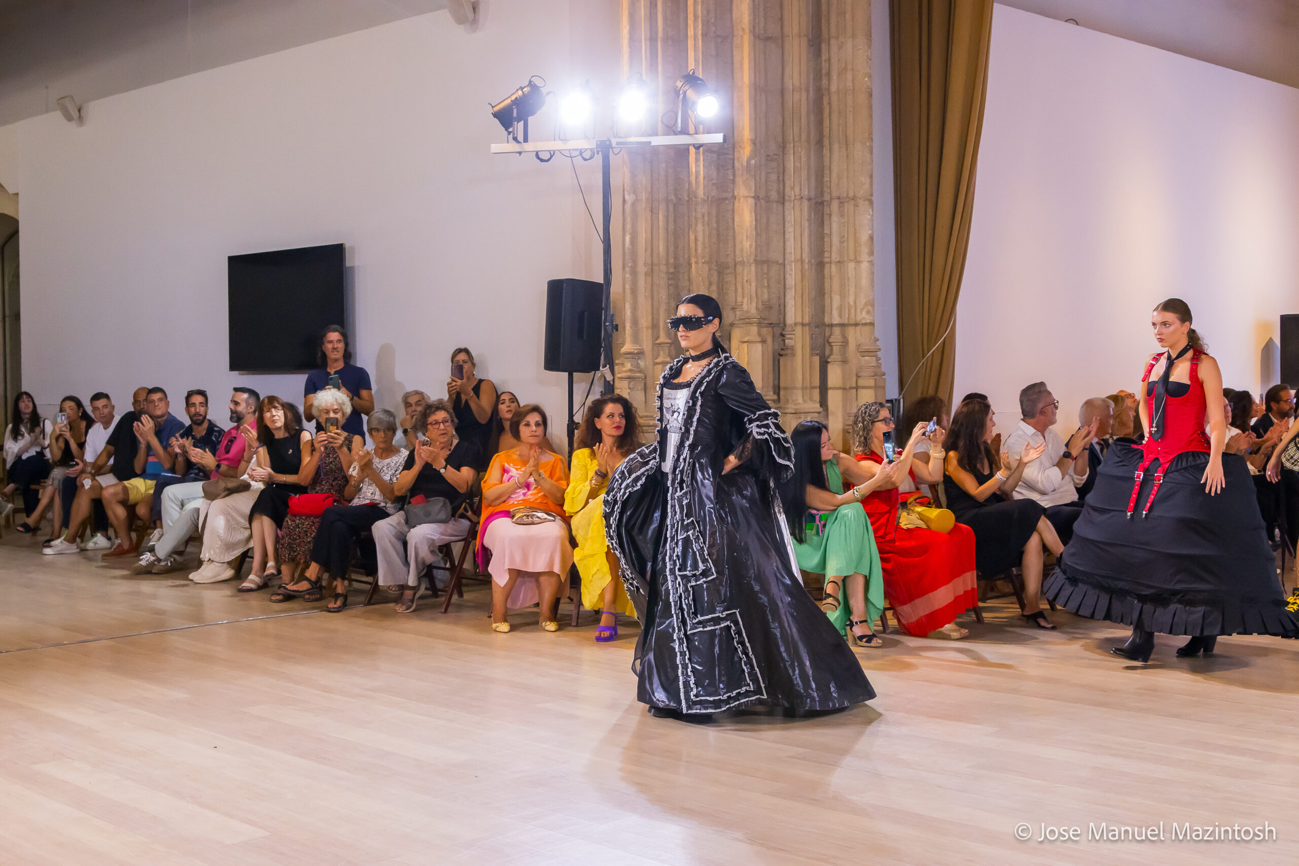 Fui seleccionada y presento mi primera colección VOLAVERUNT inspirada en Francisco De Goya, concretamente en su grabado “Volaverunt” y en la excelente visión cinematográfica de Bigas Luna, y la excelente interpretación de Aitana Sánchez Gijón. Es un homenaje a los comienzos de la liberación femenina y por ello una reverencia a todas las mujeres luchadoras a lo largo de la historia. Un viaje desde la opresión hacia el vuelo. Una colección que reinterpreta estructuras históricas a través de la energía del rock. Aquí, lo que antes limitaba ahora impulsa. Lo que aprisionaba, ahora libera. Volaverunt es fuerza, presencia y emancipación. Esta colección no decora, desobedece. No es moda, es resistencia vestida de arte.