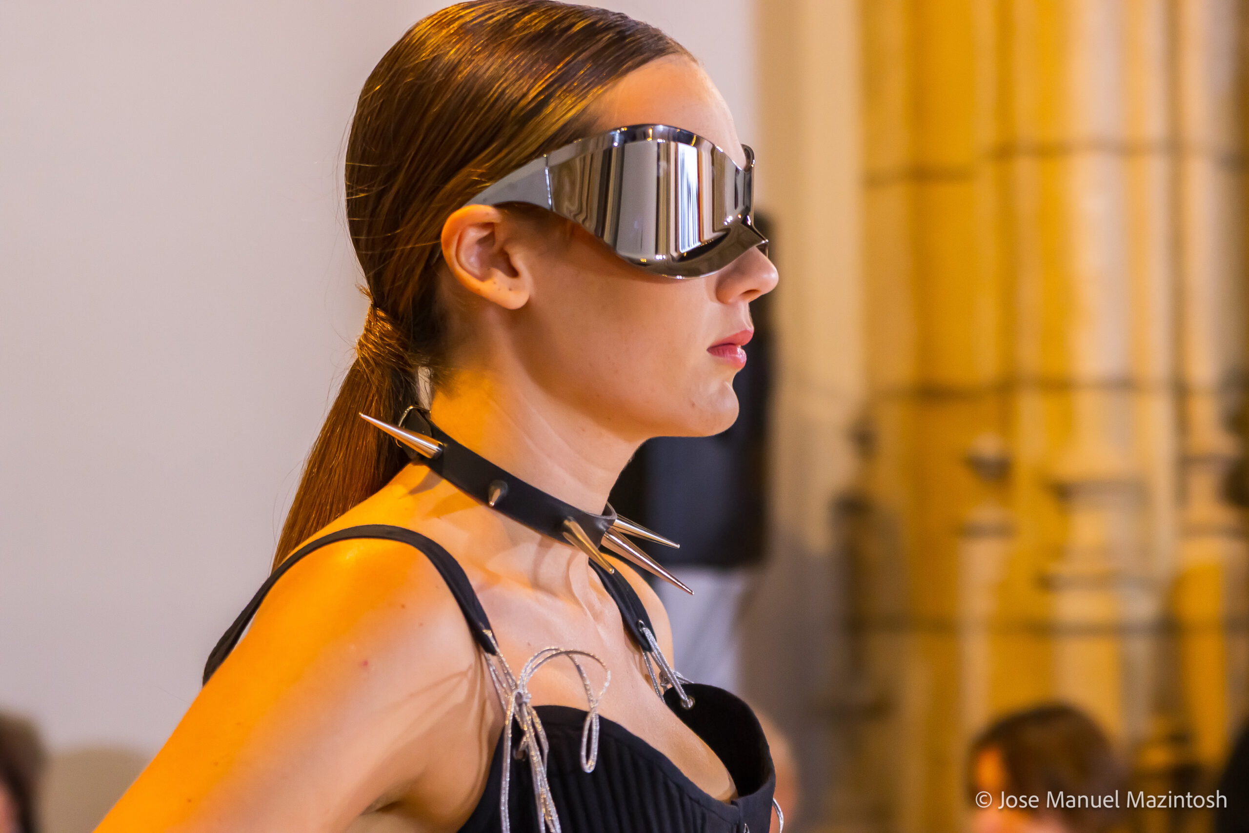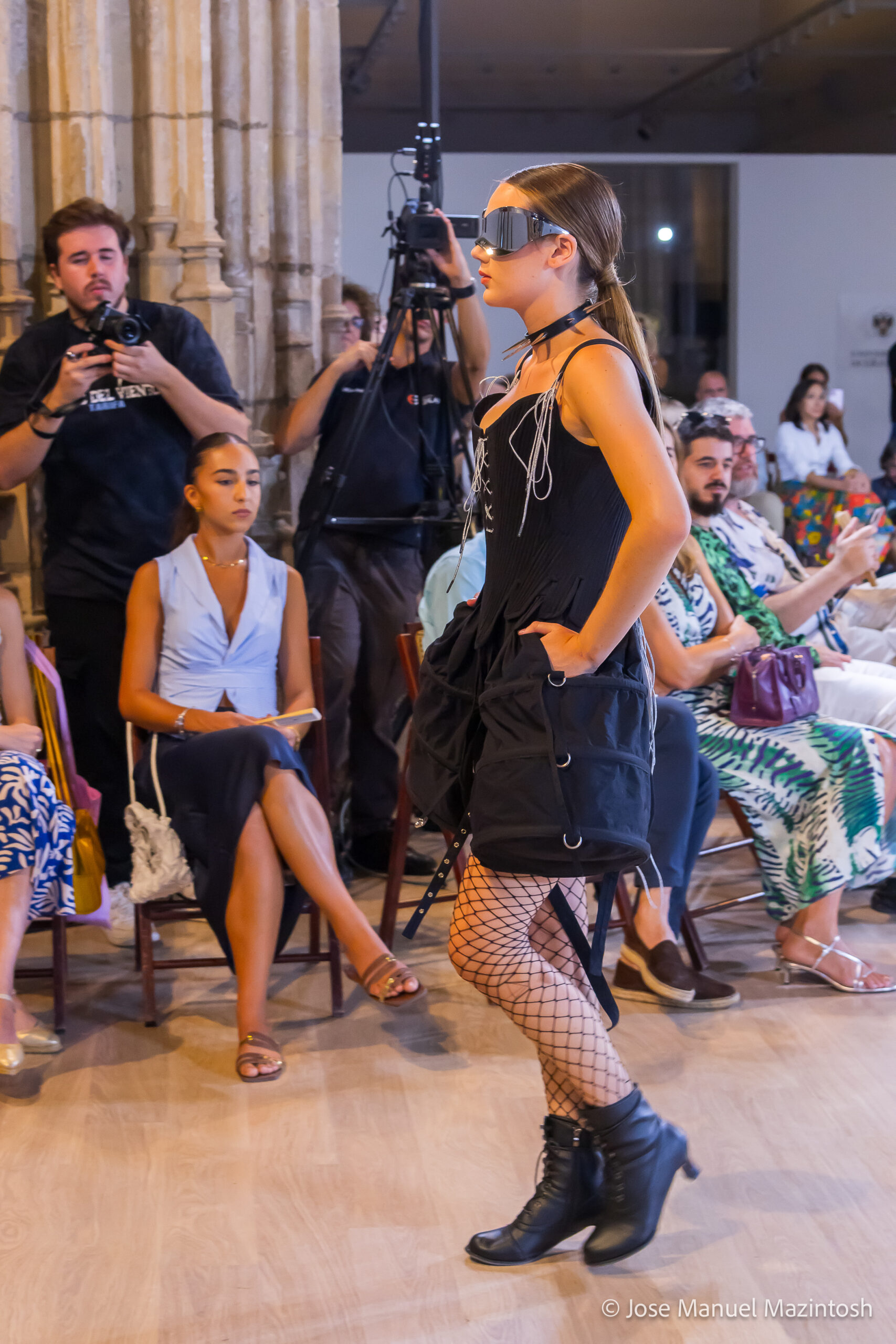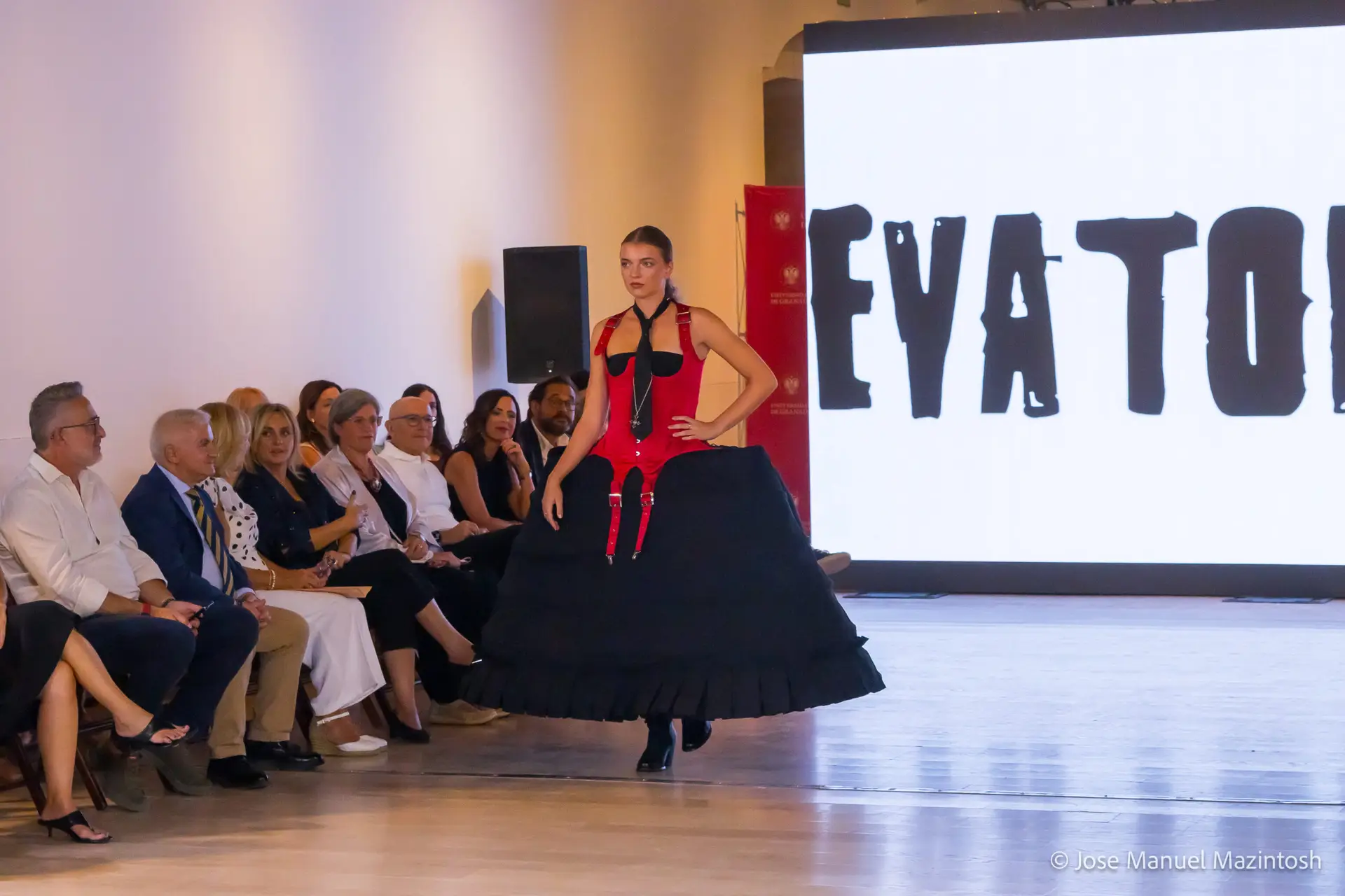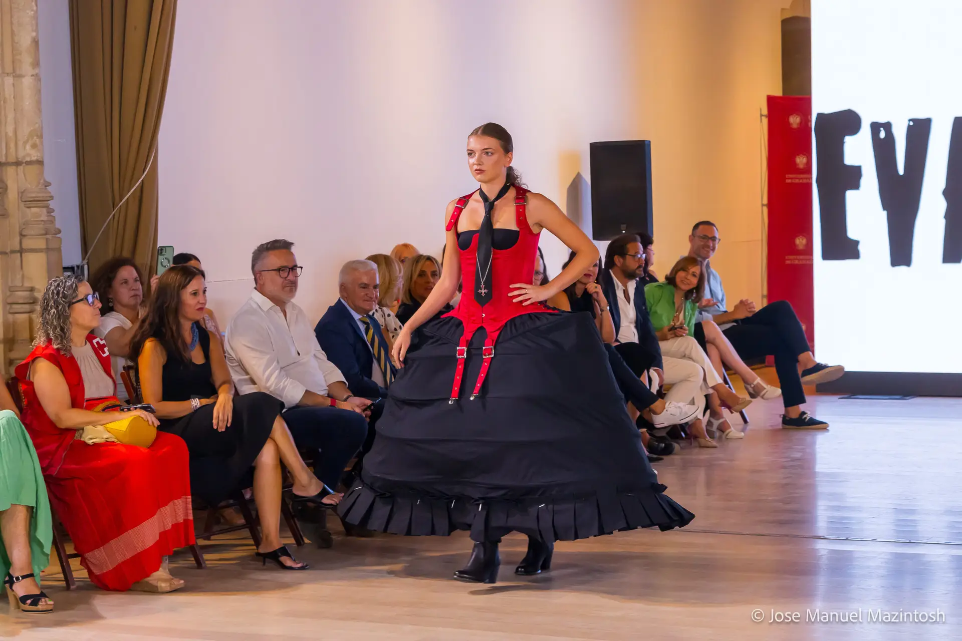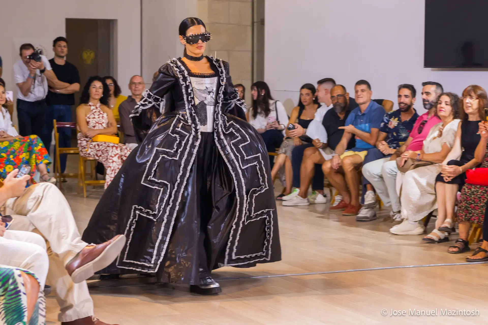 Fui seleccionada y presento mi primera colección VOLAVERUNT inspirada en Francisco De Goya, concretamente en su grabado “Volaverunt” y en la excelente visión cinematográfica de Bigas Luna, y la excelente interpretación de Aitana Sánchez Gijón. Es un homenaje a los comienzos de la liberación femenina y por ello una reverencia a todas las mujeres luchadoras a lo largo de la historia. Un viaje desde la opresión hacia el vuelo. Una colección que reinterpreta estructuras históricas a través de la energía del rock. Aquí, lo que antes limitaba ahora impulsa. Lo que aprisionaba, ahora libera. Volaverunt es fuerza, presencia y emancipación. Esta colección no decora, desobedece. No es moda, es resistencia vestida de arte.
