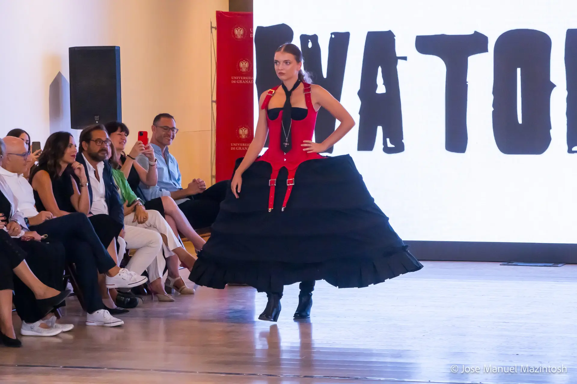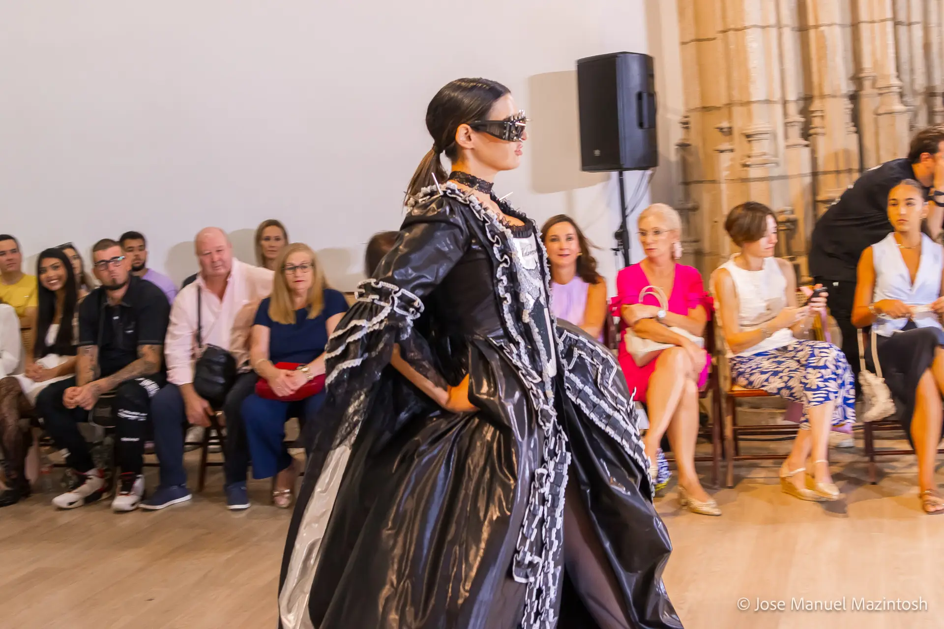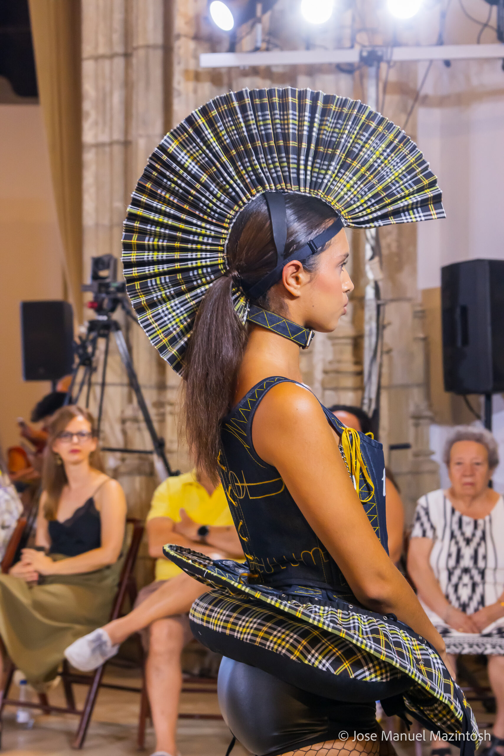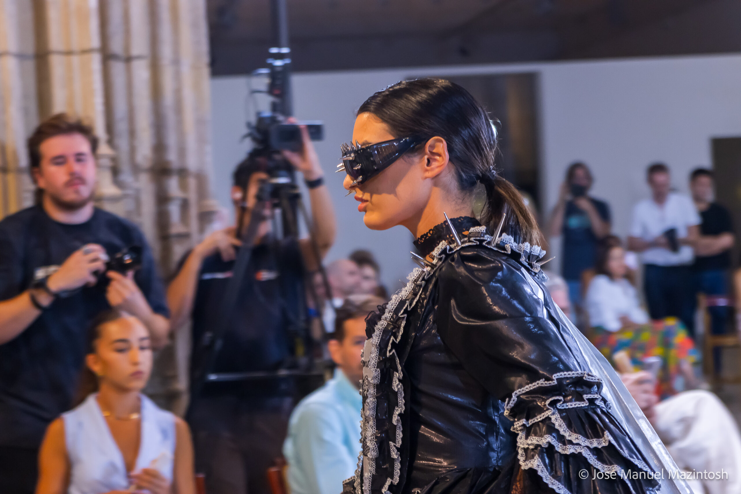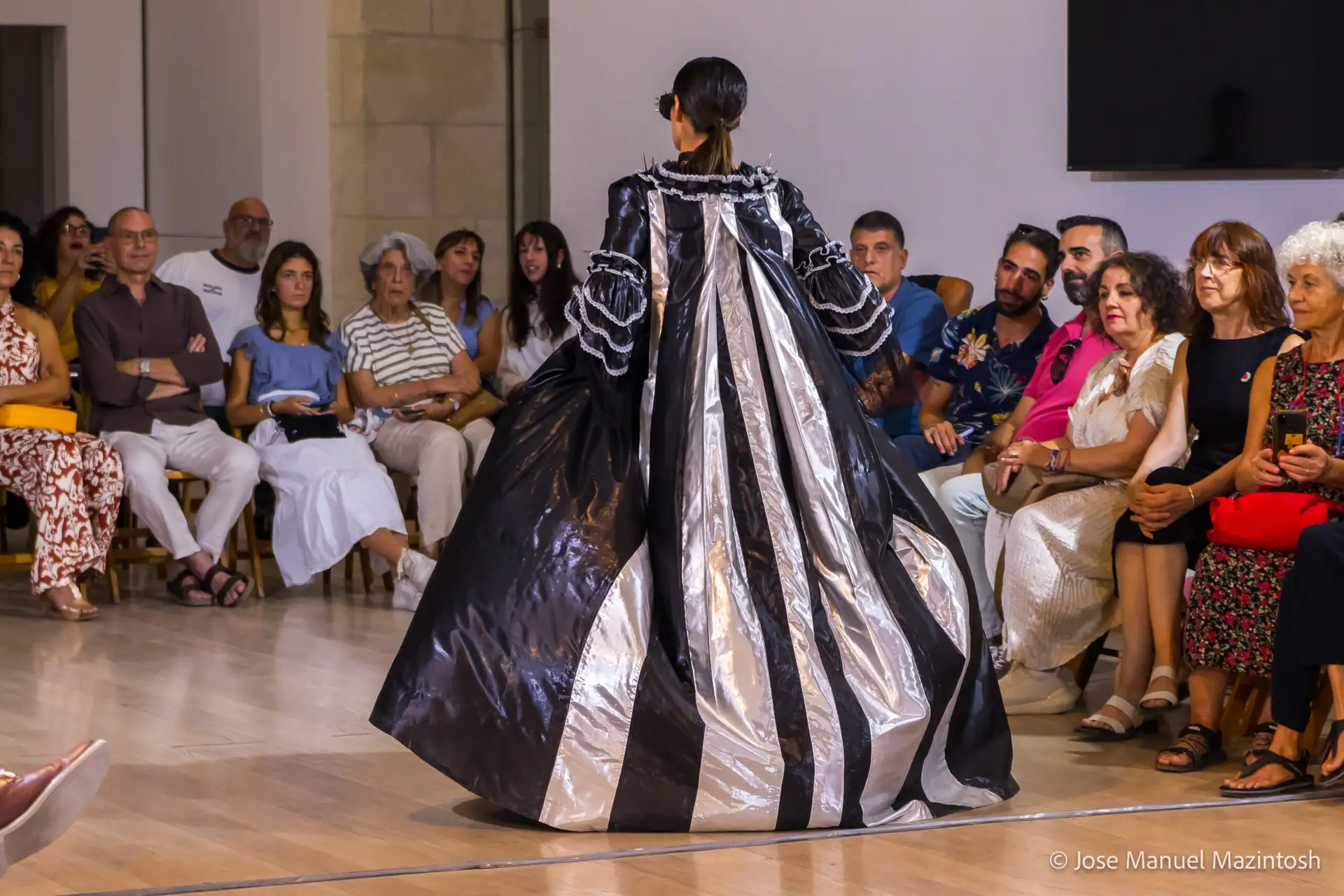 Fui seleccionada y presento mi primera colección VOLAVERUNT inspirada en Francisco De Goya, concretamente en su grabado “Volaverunt” y en la excelente visión cinematográfica de Bigas Luna, y la excelente interpretación de Aitana Sánchez Gijón. Es un homenaje a los comienzos de la liberación femenina y por ello una reverencia a todas las mujeres luchadoras a lo largo de la historia. Un viaje desde la opresión hacia el vuelo. Una colección que reinterpreta estructuras históricas a través de la energía del rock. Aquí, lo que antes limitaba ahora impulsa. Lo que aprisionaba, ahora libera. Volaverunt es fuerza, presencia y emancipación. Esta colección no decora, desobedece. No es moda, es resistencia vestida de arte.